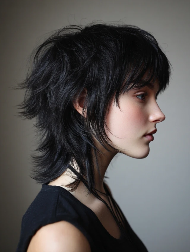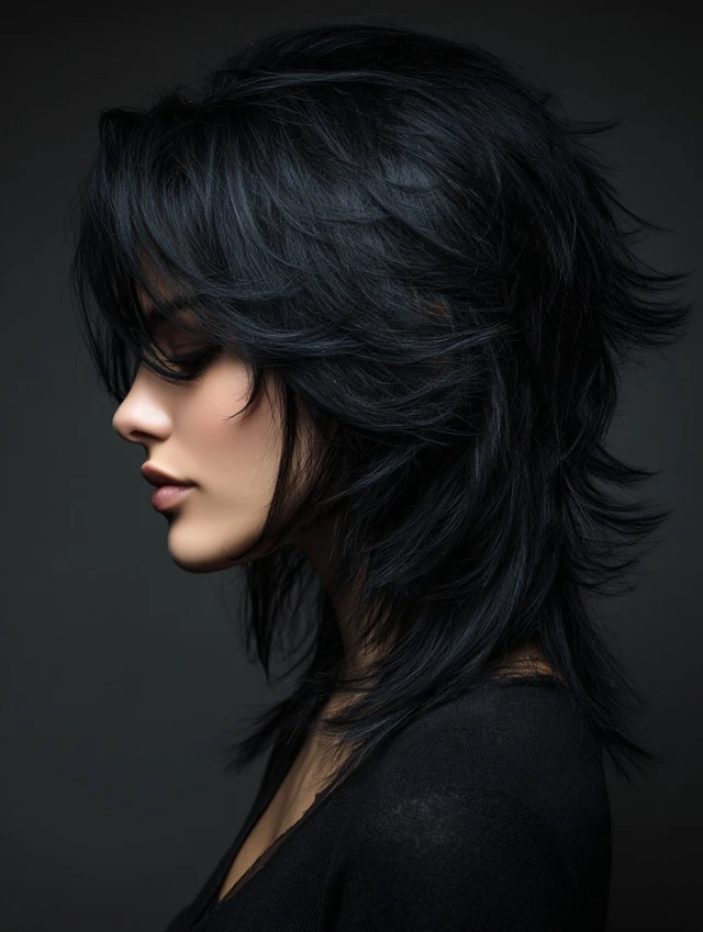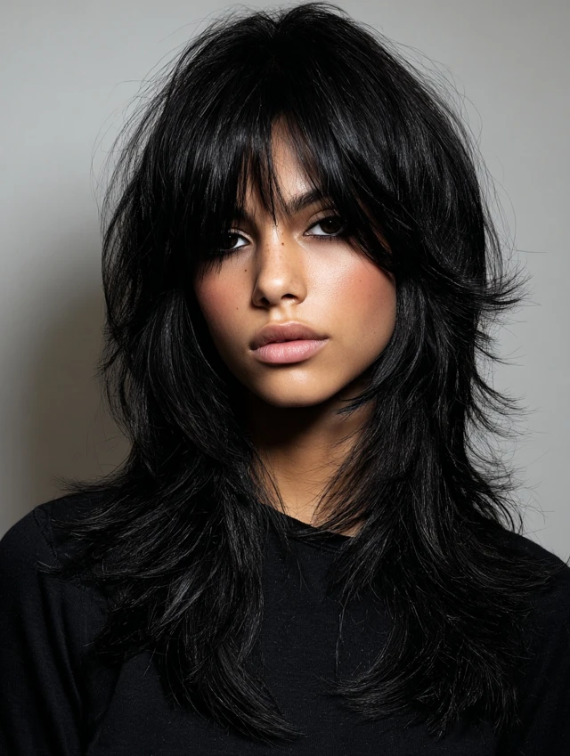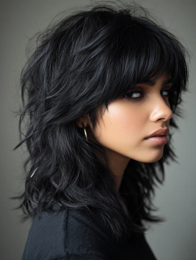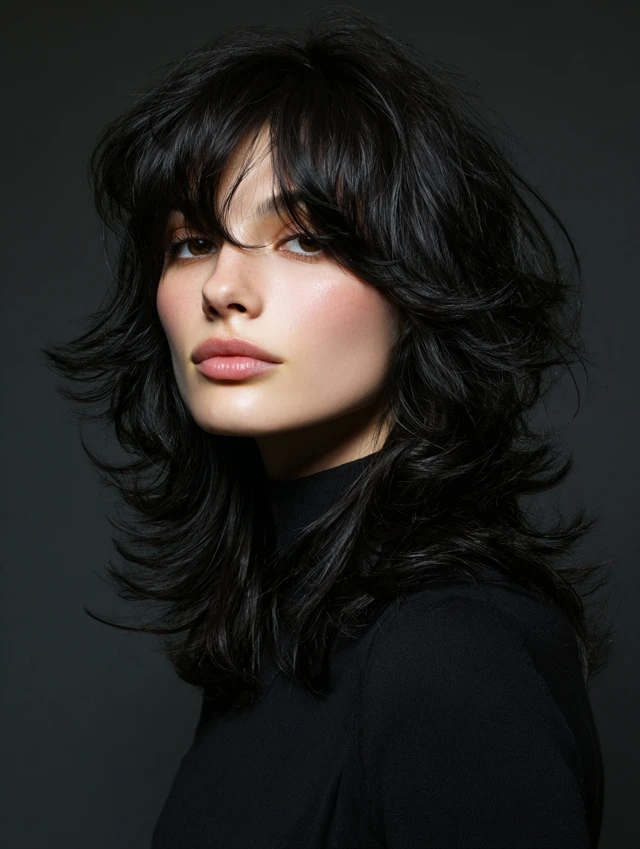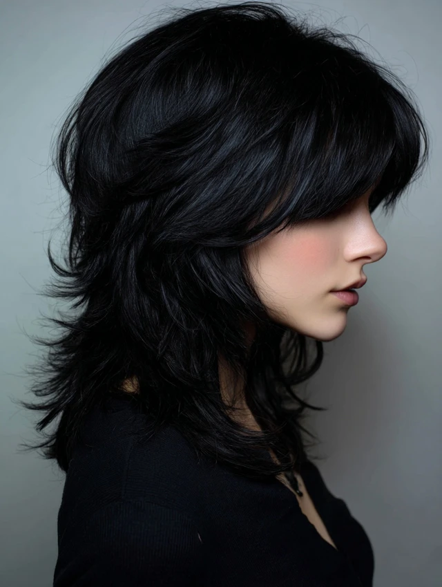 The black wolf cut is a bold, edgy hairstyle defined by choppy layers, lifted crown, and feathered ends. Its dark color enhances depth and contrast, making every layer more pronounced. This cut works for straight, wavy, or slightly curly hair and suits most face shapes. Styled tousled, messy, or sleek, the black wolf cut exudes modernity, drama, and effortless edge, making it perfect for women who want a statement-making haircut with low-maintenance styling.