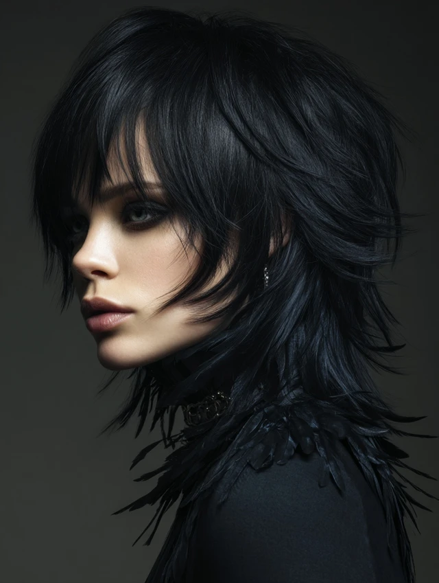 Edgy black wolf cuts include asymmetrical layers and bold, feathered ends. Works best for oval or heart-shaped faces looking for dramatic, fashion-forward flair.