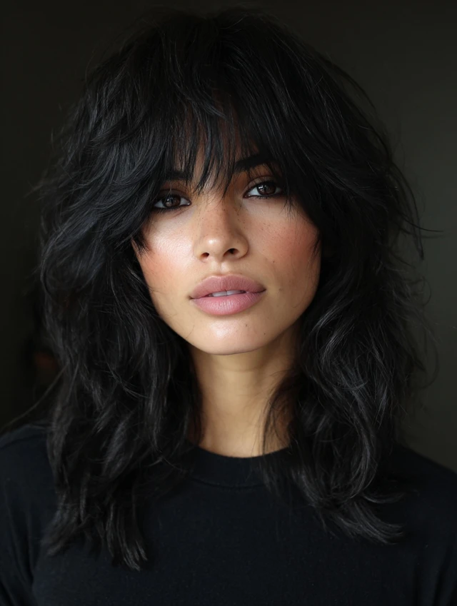 Wavy black wolf cuts highlight natural waves, enhancing texture while maintaining volume. Crown layers lift hair while ends flow freely. Works best for oval, heart, and round faces.