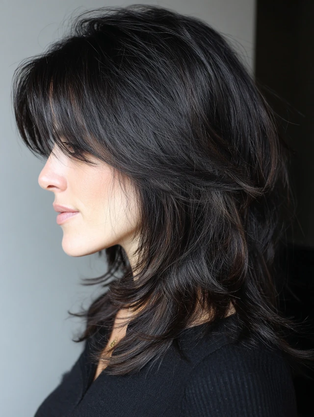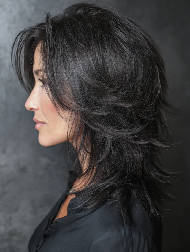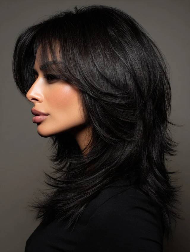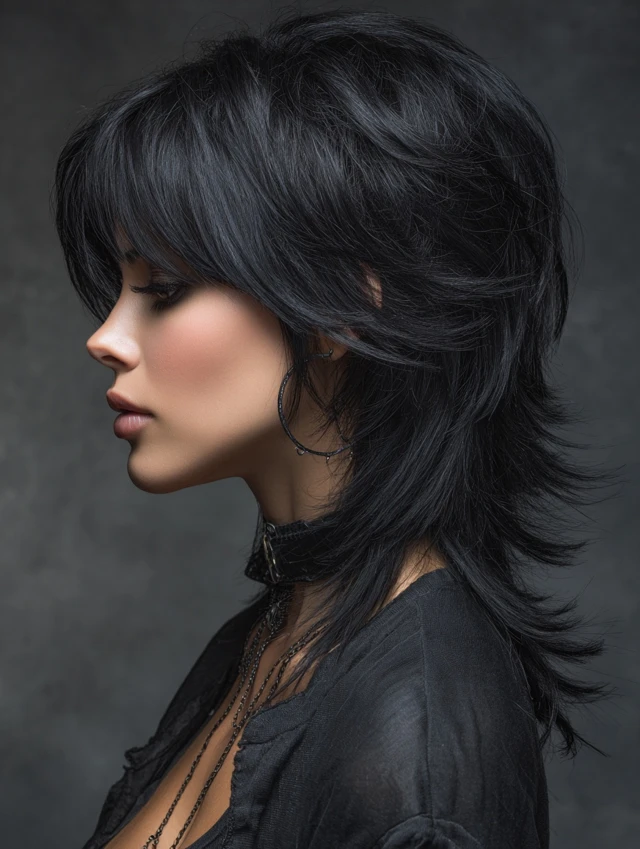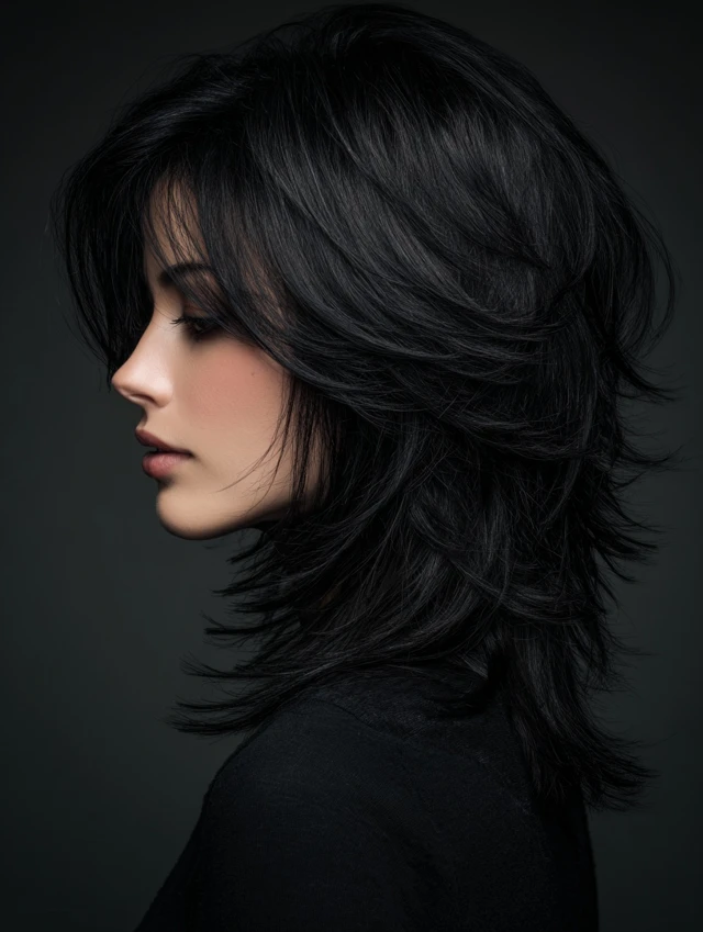 Layered black wolf cuts emphasize crown lift while tapering ends for softness. Works well for round or oval faces, balancing features with a polished edge.