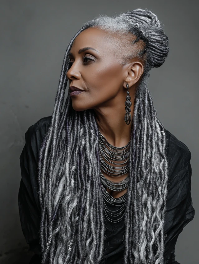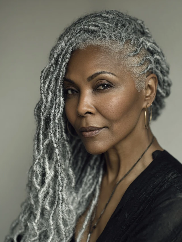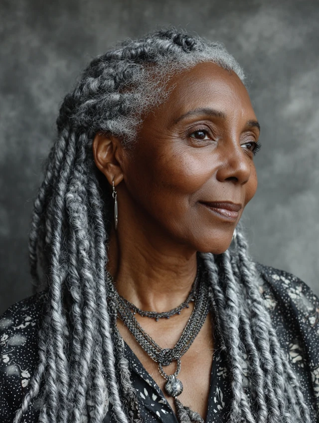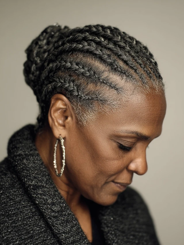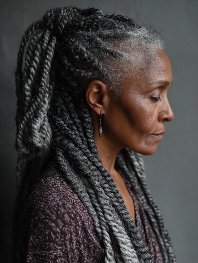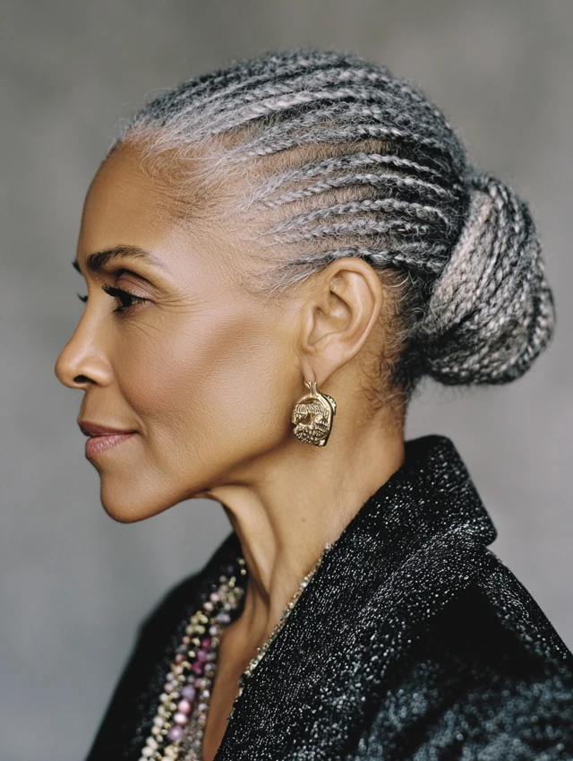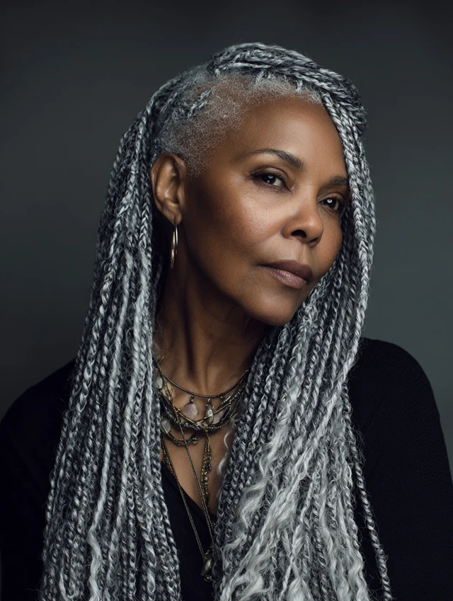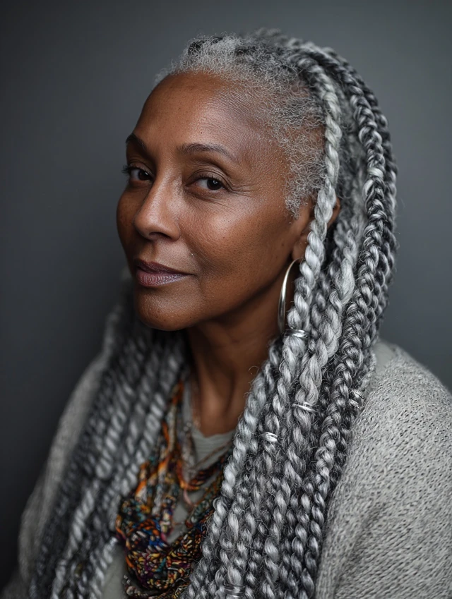 Knotless braids start without bulky knots, which makes them lighter and gentler on sensitive scalps. Blending gray or silver strands creates a natural, confident finish.