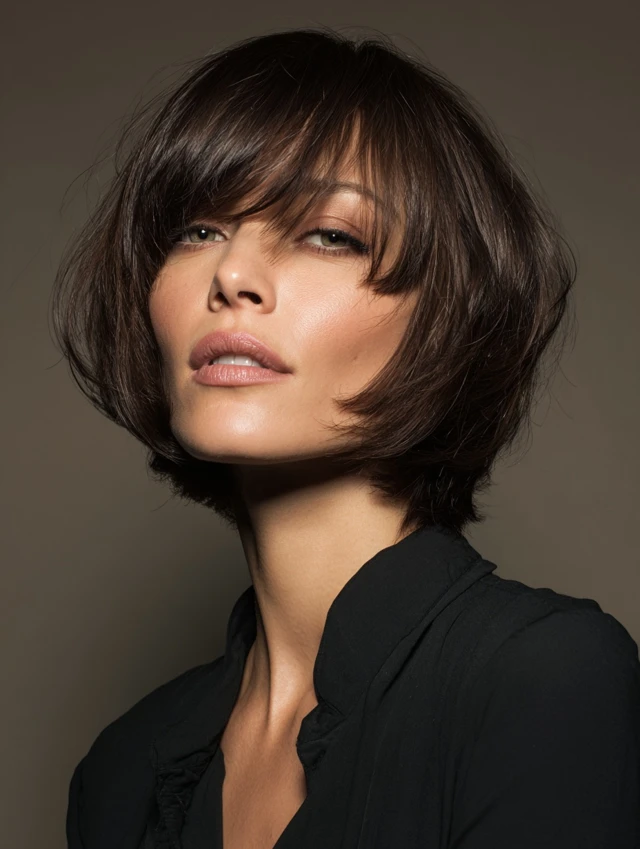 An angled bob with side-swept bangs elongates the face and balances features. The longer front layers soften the jawline while the bangs frame the eyes.