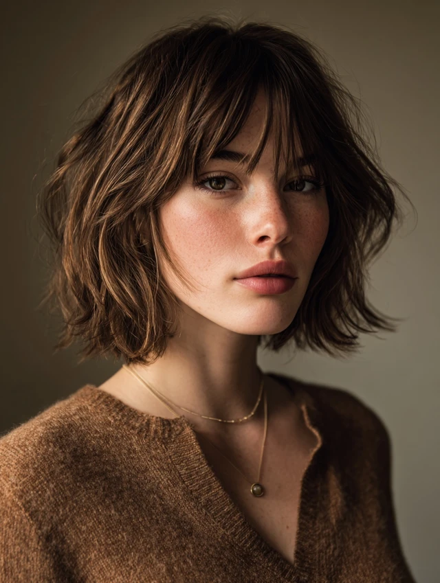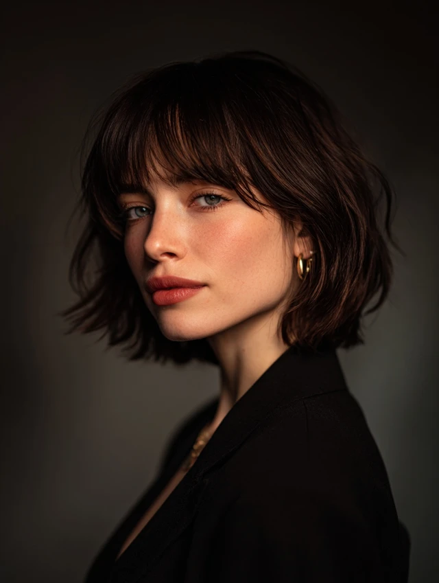 A textured chin-length bob with wispy bangs adds softness and movement. The layers and light fringe prevent the haircut from looking too harsh.