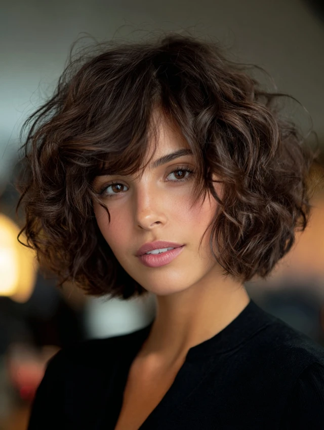 A curly chin-length bob with side bangs adds volume and softness. The side fringe complements natural curls while balancing facial proportions.