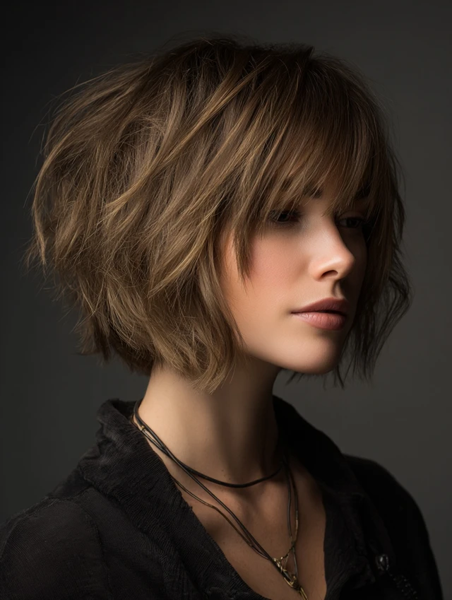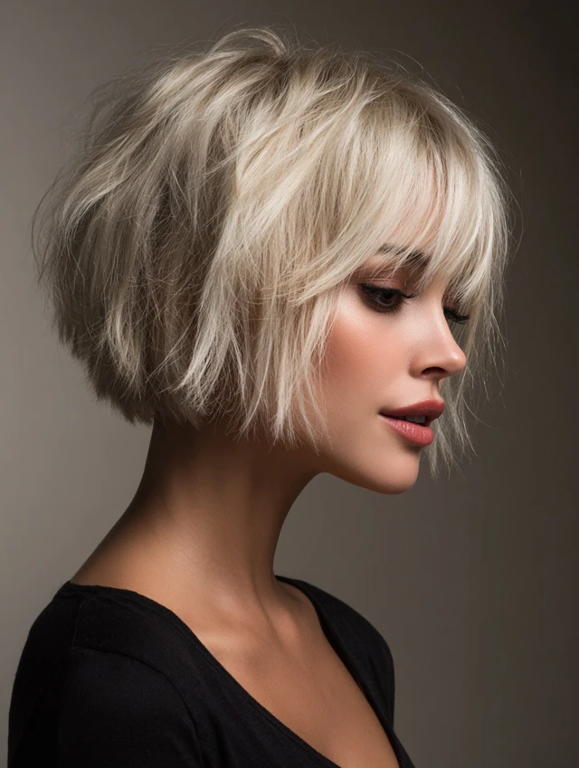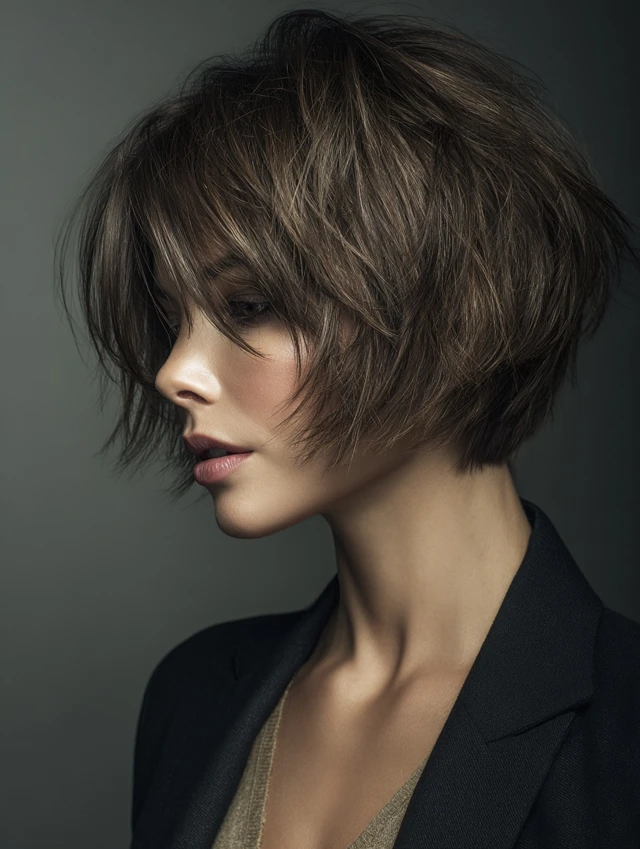 This version sits near the jaw with short layers stacked at the top for lift. It flatters round and heart-shaped faces by adding height and narrowing the outline. Fine hair benefits from the volume boost, while thick hair feels lighter and more breathable.