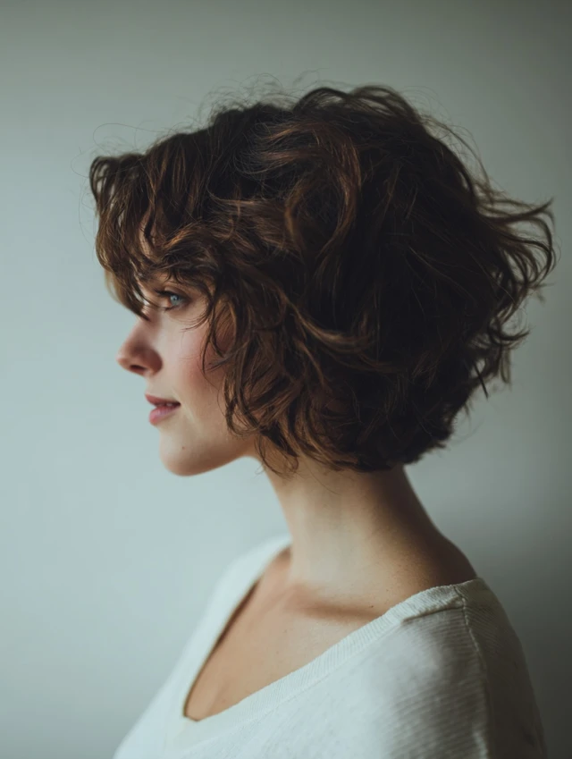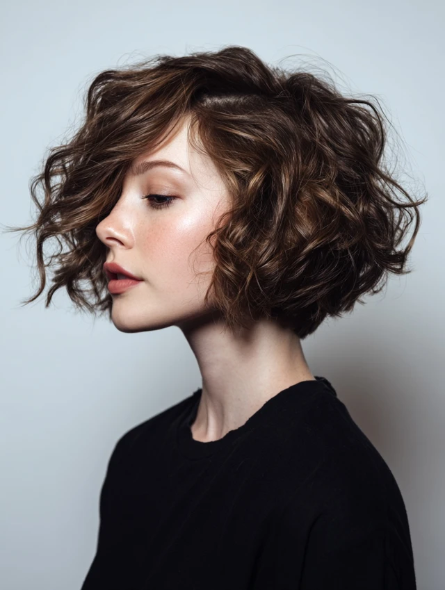 A curly choppy bob stacks volume at the crown while carving weight from the sides and ends. It works well on square or long faces because curls frame the cheeks naturally. Natural curl patterns shine with this layered approach.