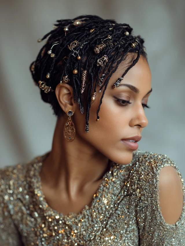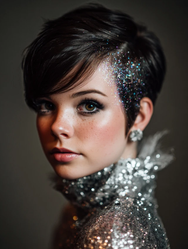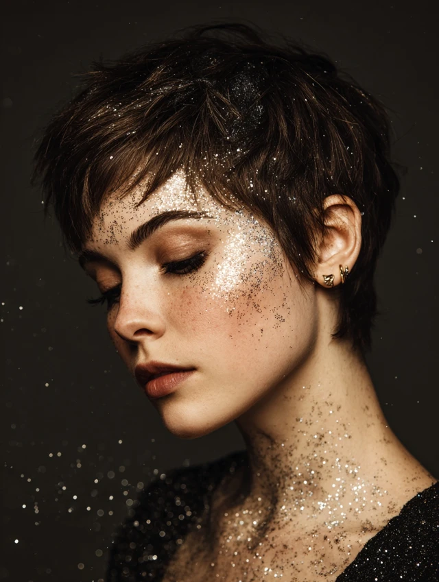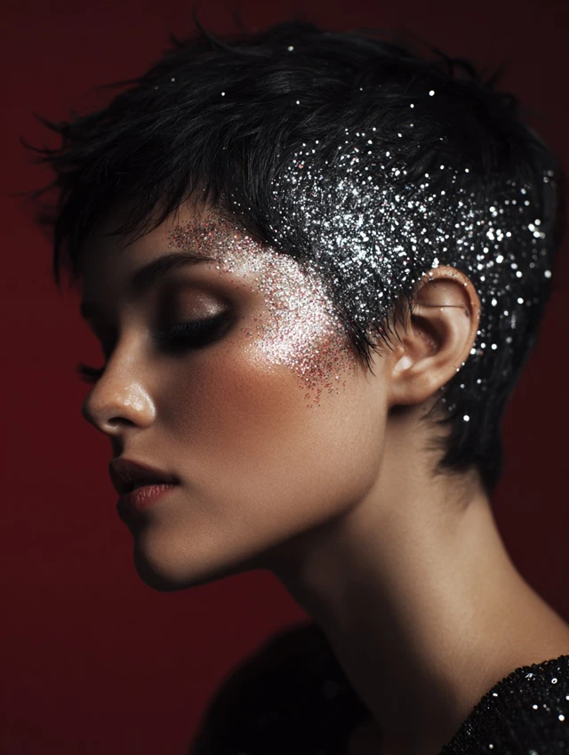 Works on sleek pixies and tapered cuts. Apply sparingly with a brush. This look fits bold party outfits and night events.