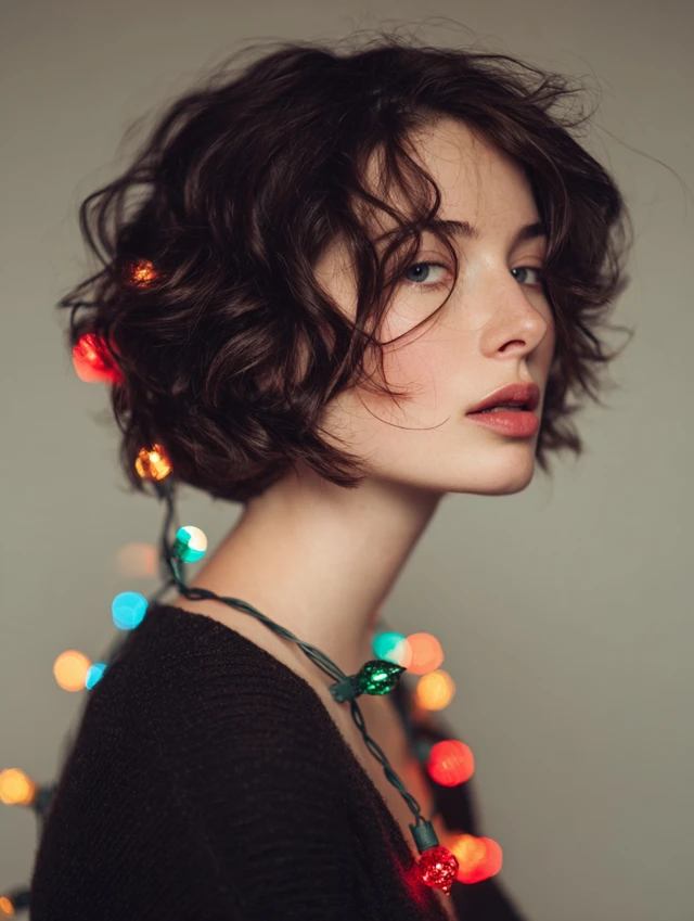 Loose curls ripple through a pixie or bob, adding shine and movement that catches twinkle lights beautifully.