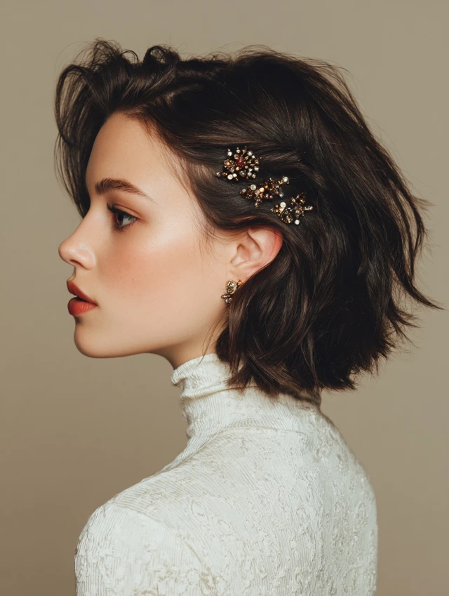Accessories do the rest. Barrettes, pearl pins, velvet bows, and metallic clips instantly elevate simple styles. Because short hair keeps things light, these looks stay comfortable through dinners, dancing, and long family gatherings.