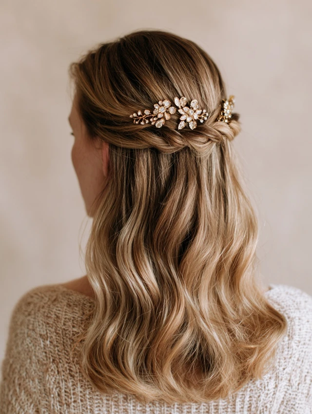 Front sections sweep back and pin with jeweled or pearl clips. The lift brightens the face while keeping hair tidy.