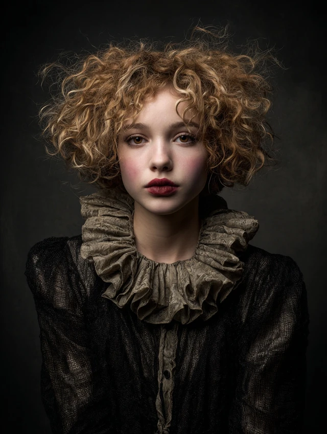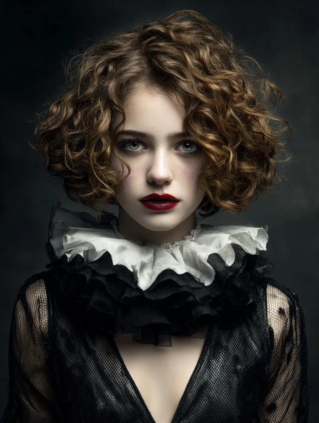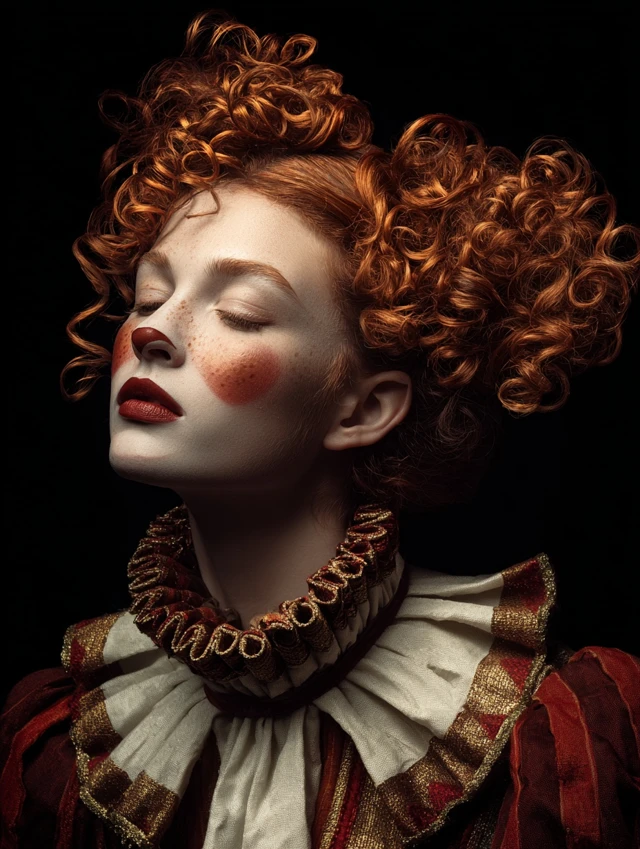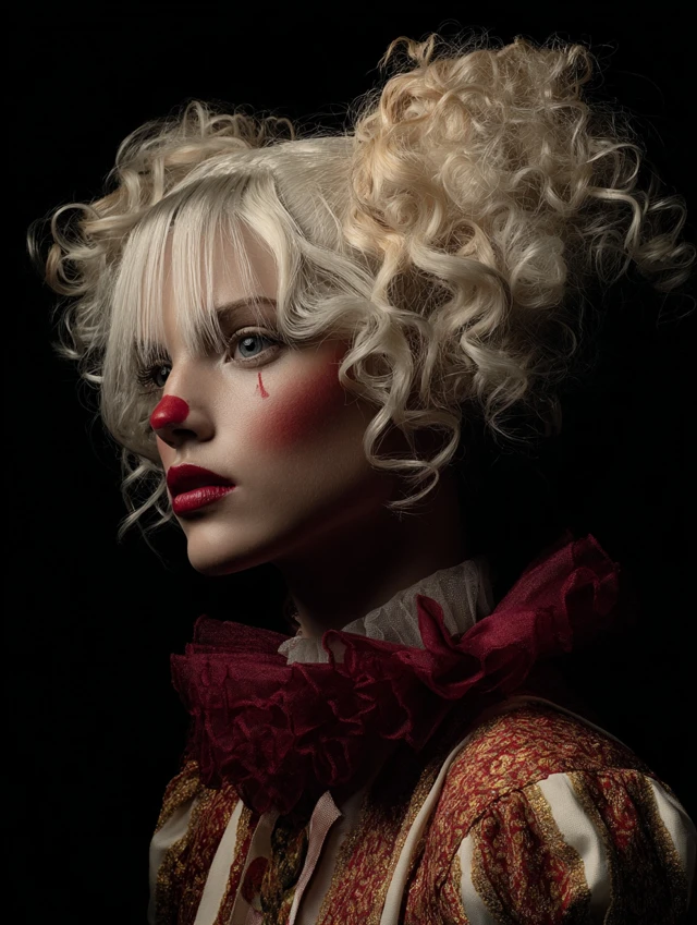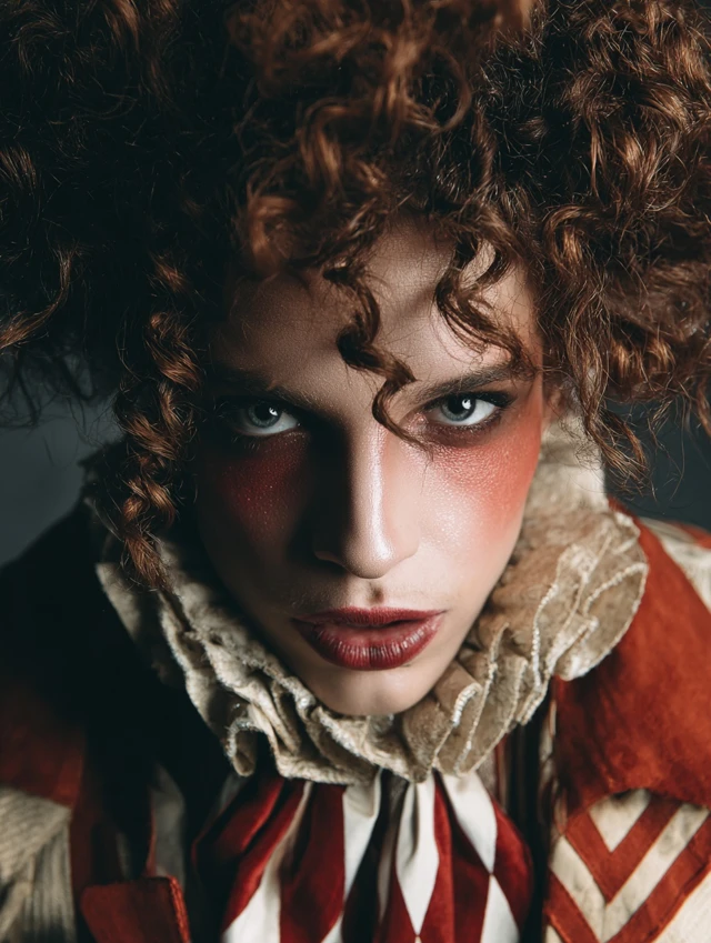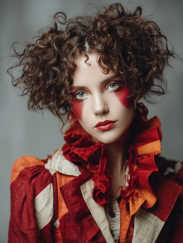 Naturally curly hair adapts easily with teasing and spray. Wigs work well too. This version suits subtle clown costumes and creative photoshoots.