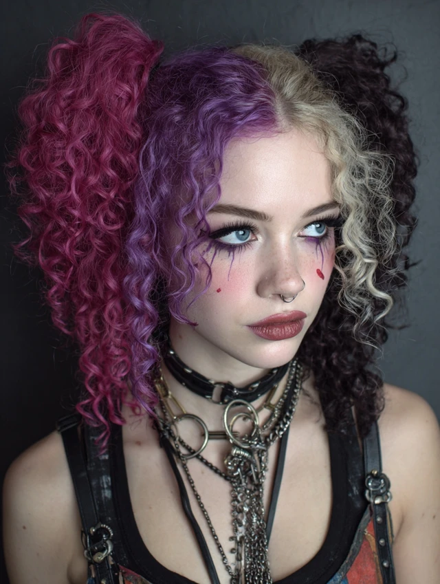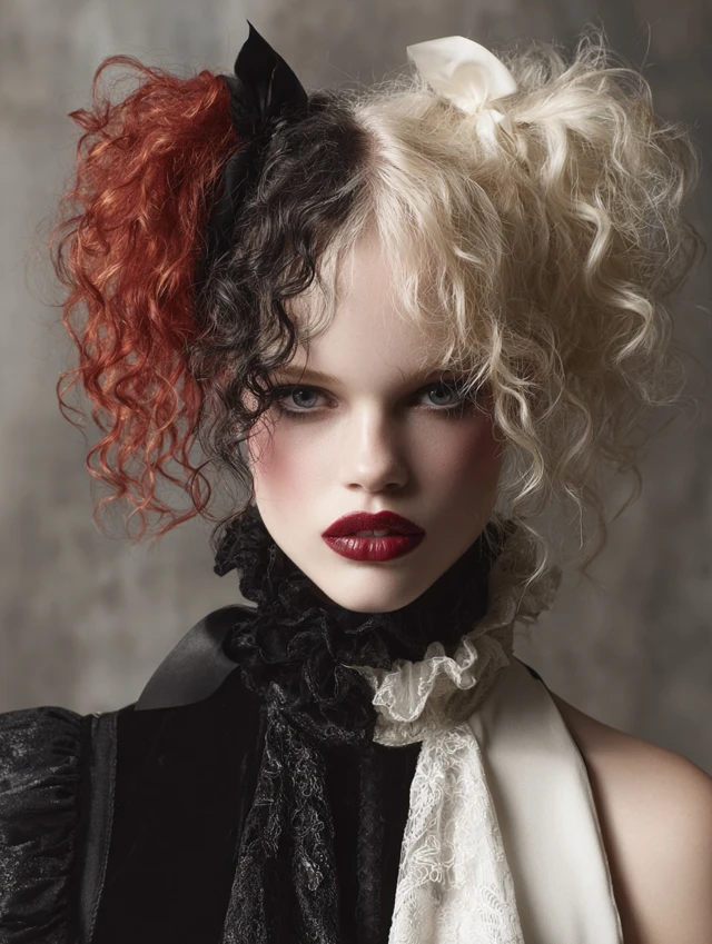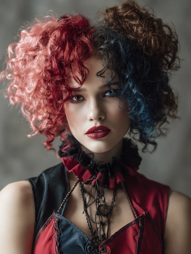 Hair divides straight down the middle with contrasting colors on each side—often red and black, white and blue, or neon combos. Waves or curls amplify the effect.