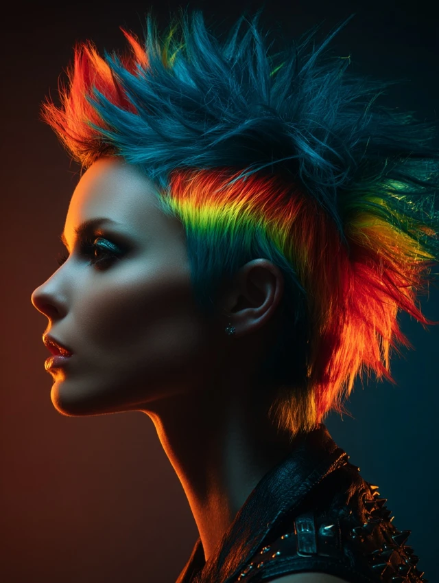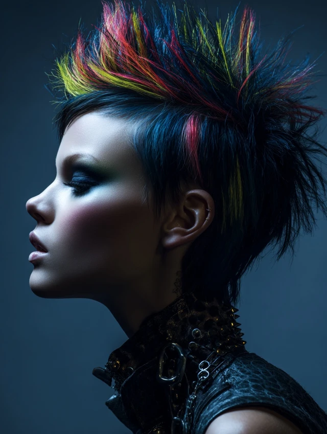 Short hair shoots outward in stiff, gravity-defying points using gel or wax. Neon streaks push the drama higher.