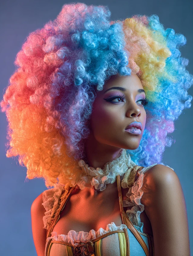 This look features dense, rounded curls in bright rainbow tones. The oversized shape frames the entire face and delivers instant circus energy.