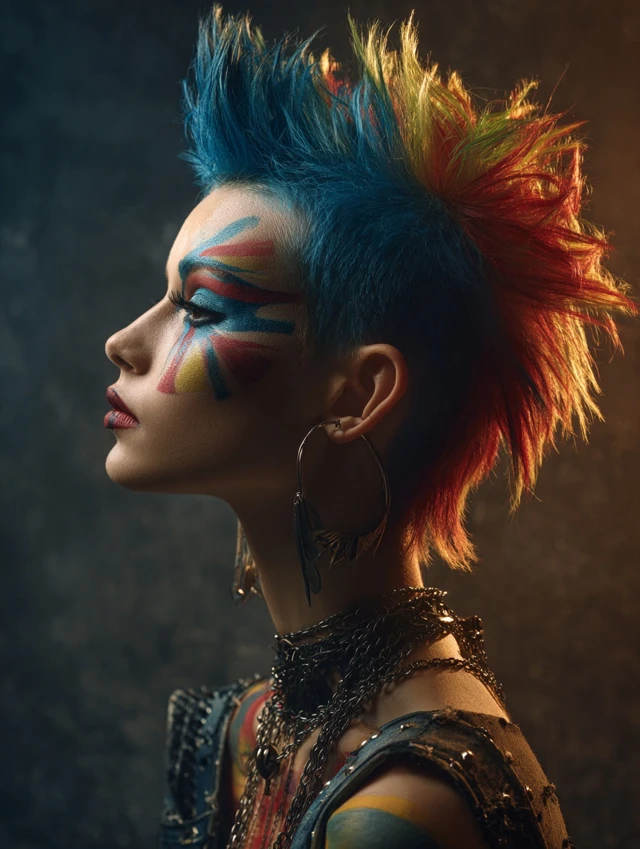 Best on cropped cuts or wigs. Use heavy-hold gel and blow-dry outward. This look fits punk-clown mashups and stage performances. Touch up spikes often.