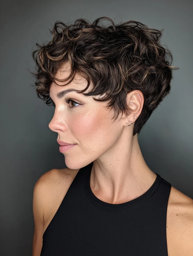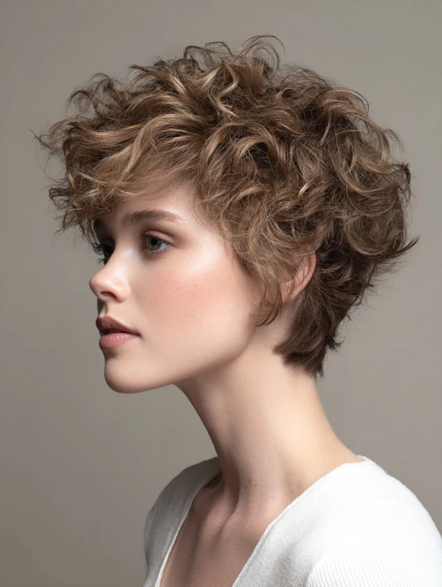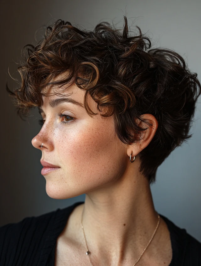 The messy curly pixie cut embraces tousled, lived-in texture. Layers create irregular shapes that enhance movement and volume. Works best for oval, heart, and round faces, adding playful charm without precision styling.