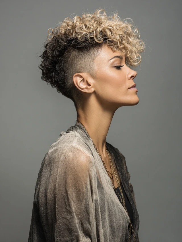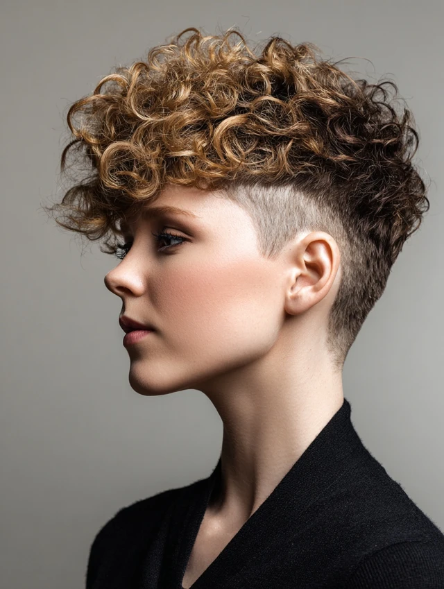 This style requires slightly more maintenance due to the undercut, but styling remains easy. Curls on top can be defined with light cream. Perfect for those who want a statement look without sacrificing practicality.