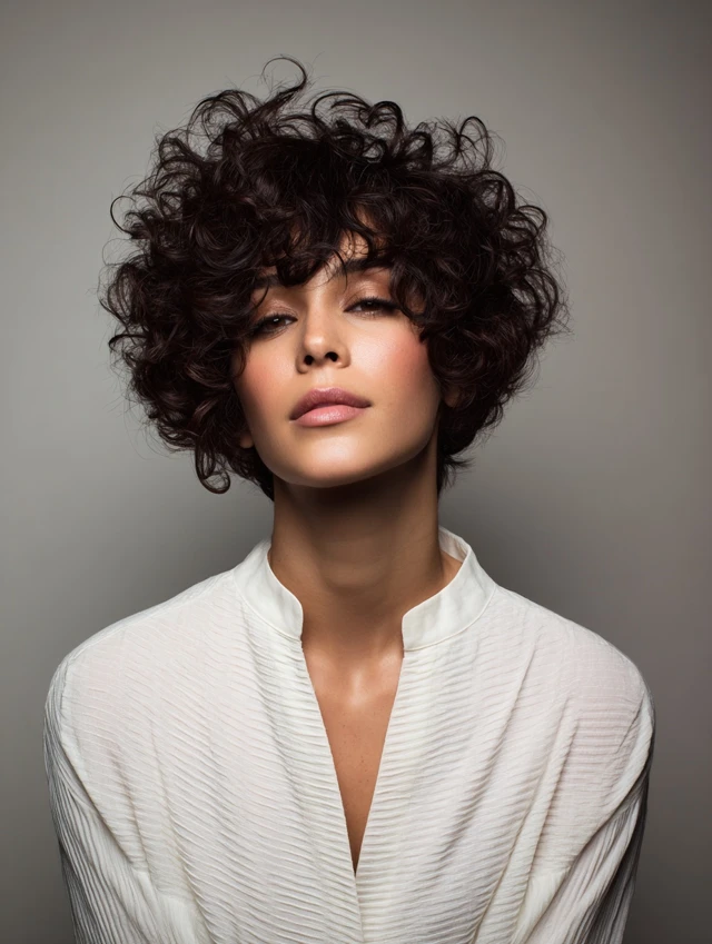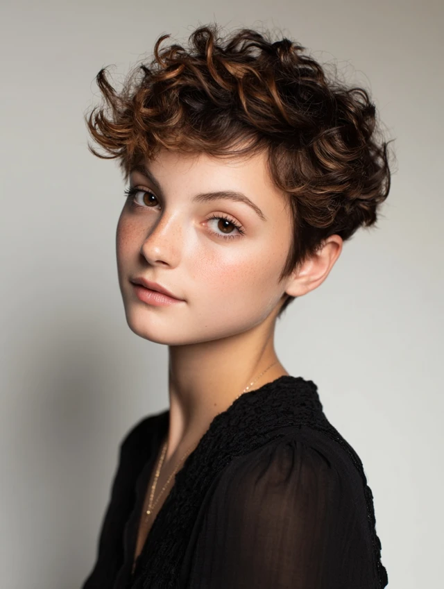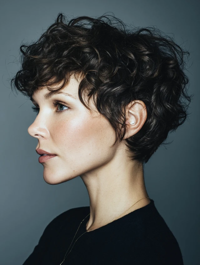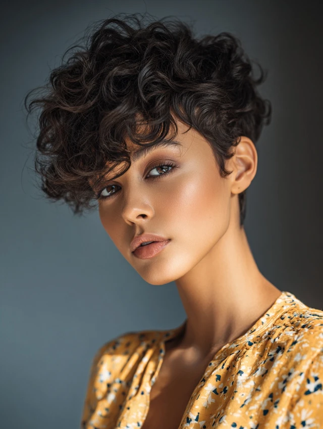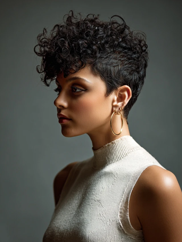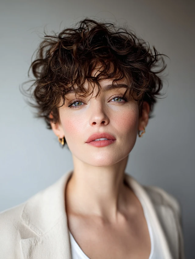 The classic curly pixie cut keeps curls soft at the crown and light at the ends. This creates a balanced, rounded silhouette. It works best for oval and heart-shaped faces, highlighting cheekbones and eyes. The cut is playful yet polished, suitable for casual or professional settings.