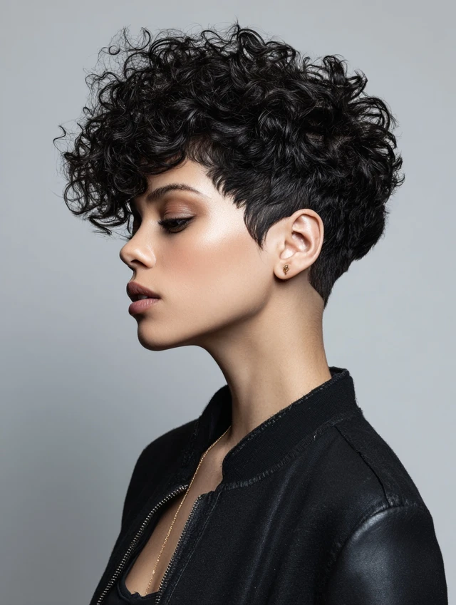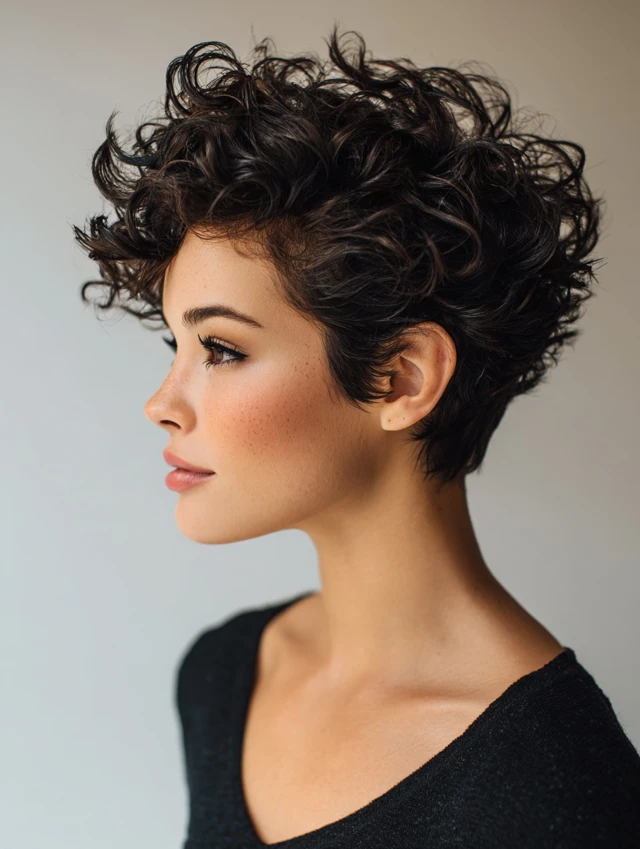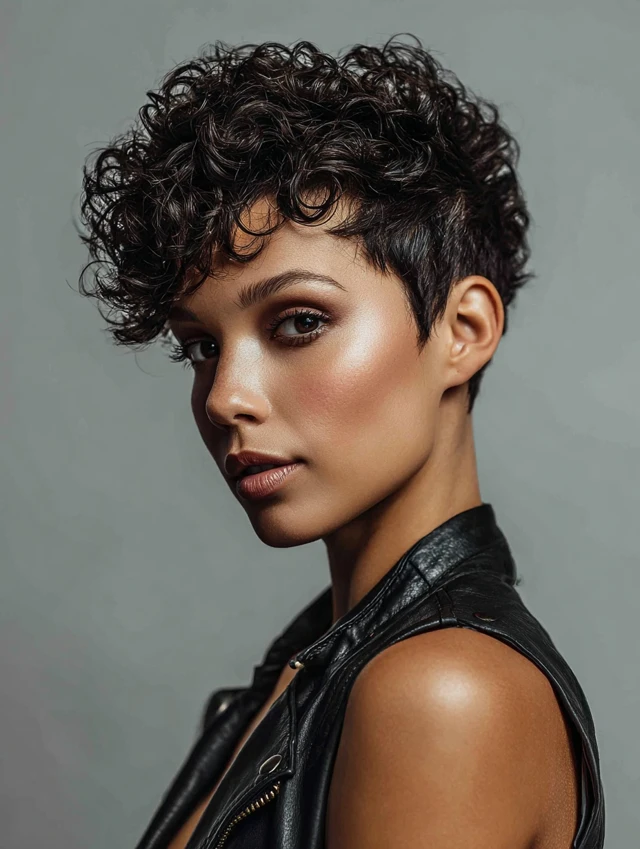 Short curly pixies with tapered sides create contrast between volume on top and sleek sides. This adds a bold, edgy look while keeping curls manageable. Works well for oval and long face shapes. The taper emphasizes facial features and adds structure.