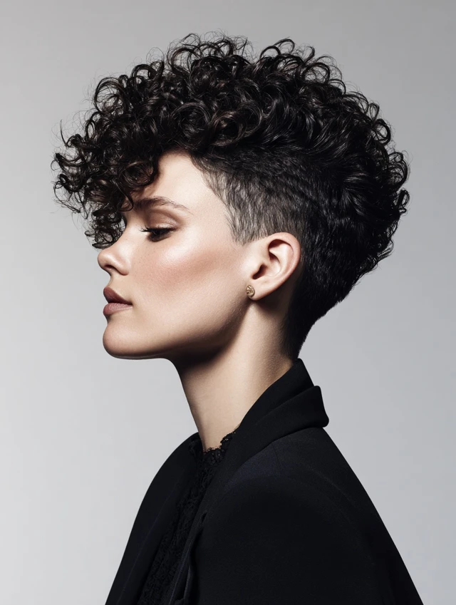 The curly pixie with an undercut emphasizes curl texture on top while keeping the sides and back minimal. The contrast creates drama and focus on natural curls. Works best for oval or square faces and bold style preferences.