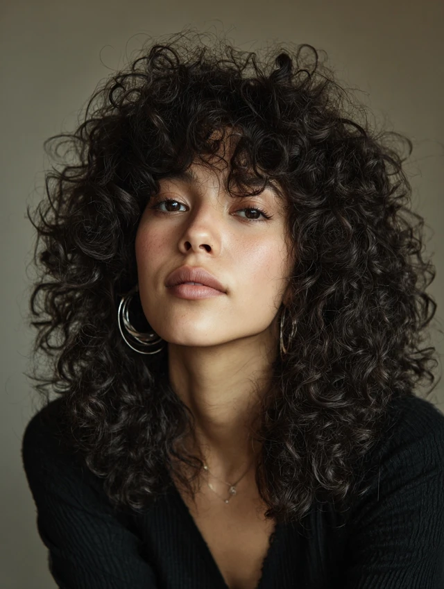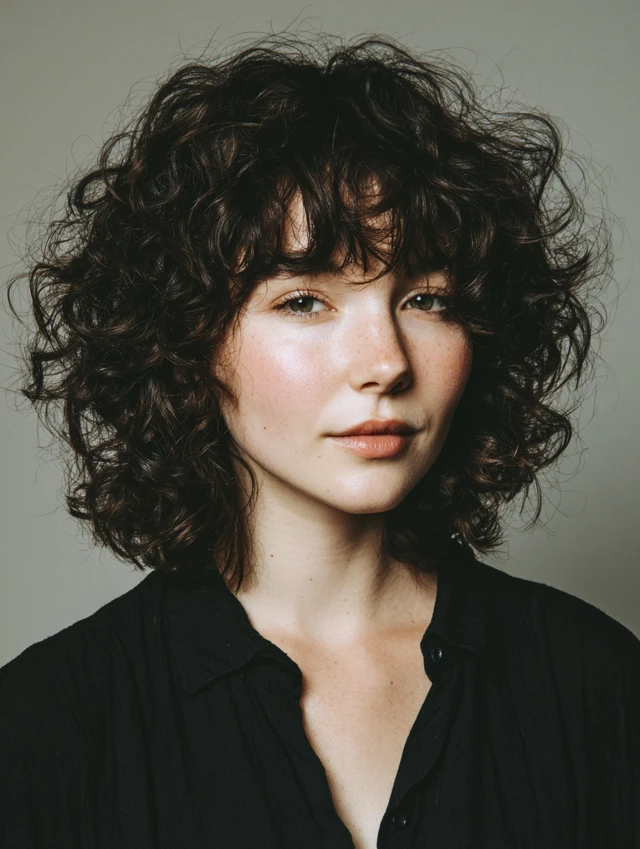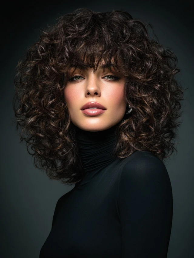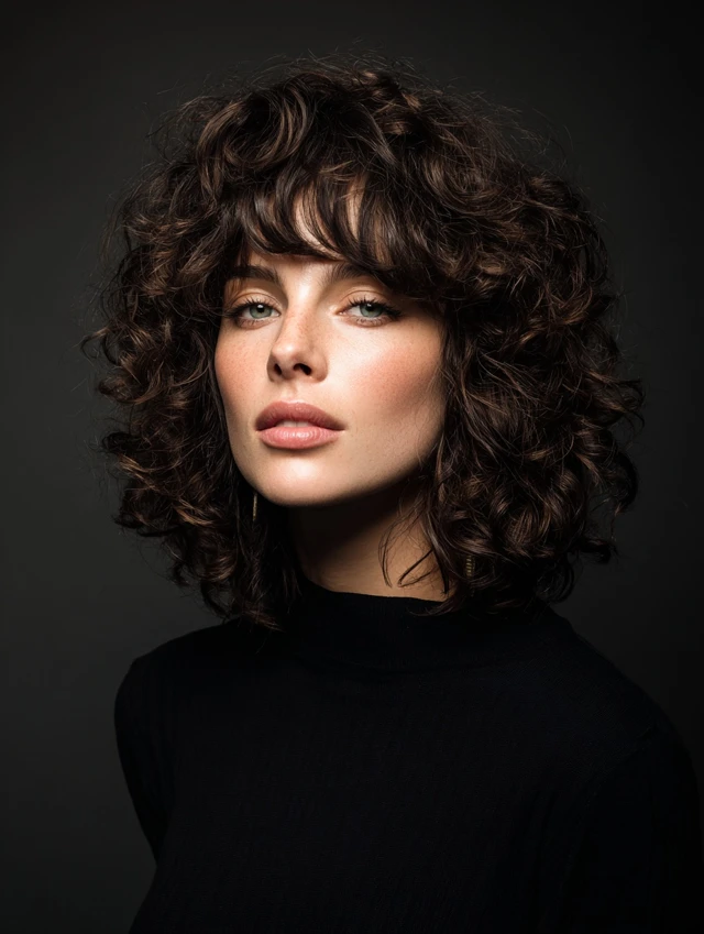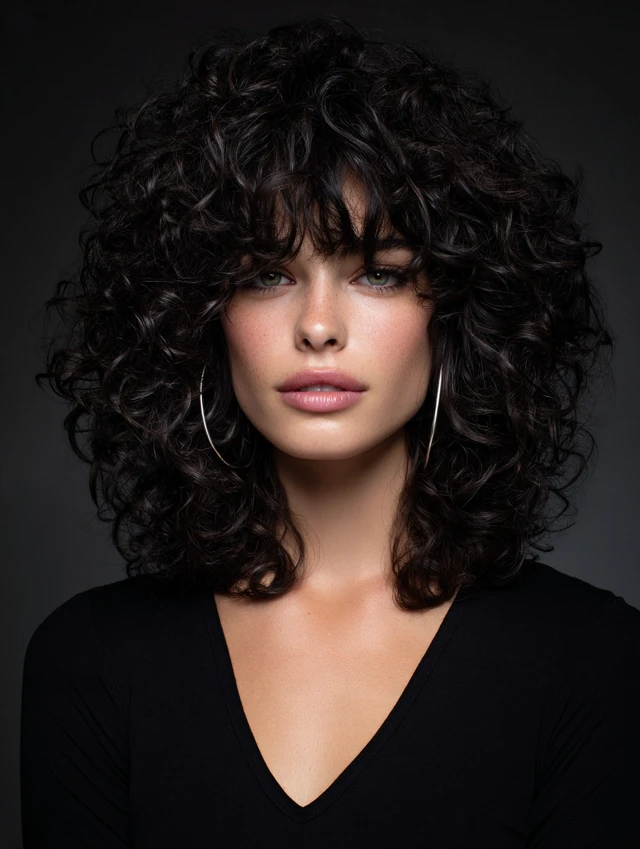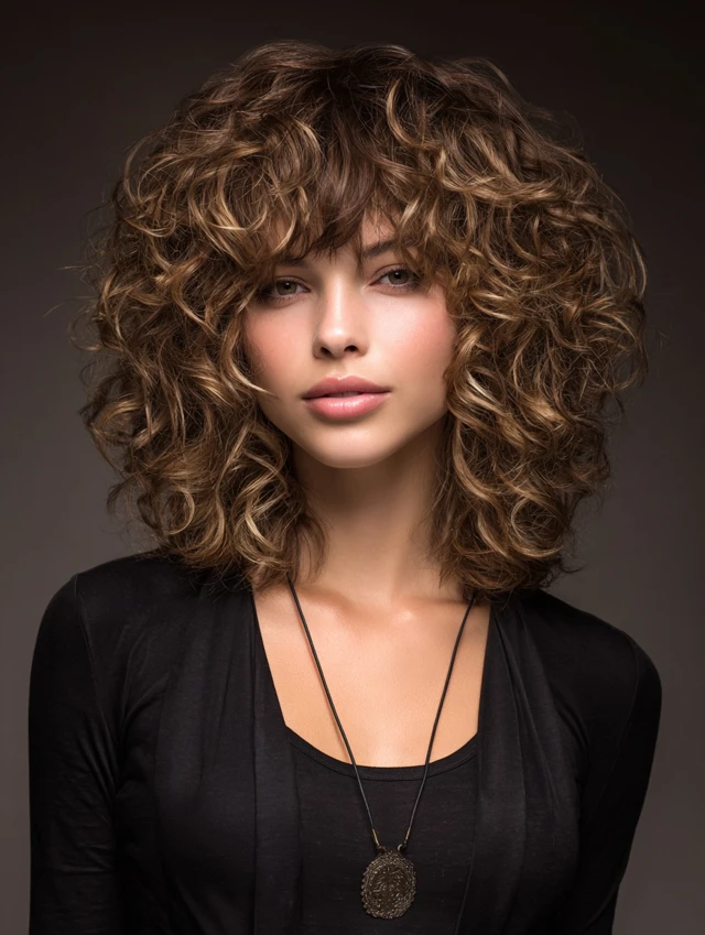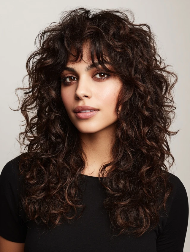 Bangs add personality and soften facial features. Curly bangs blend naturally into layered shags, creating balance and movement. Works well for oval and heart faces.