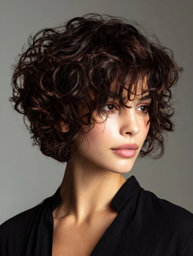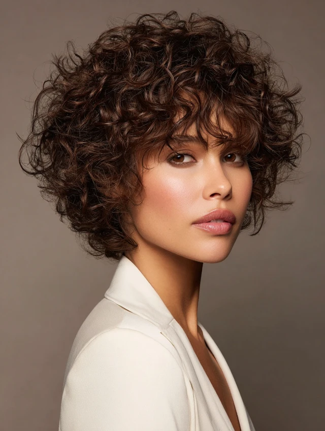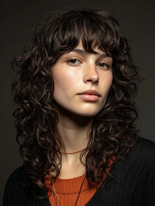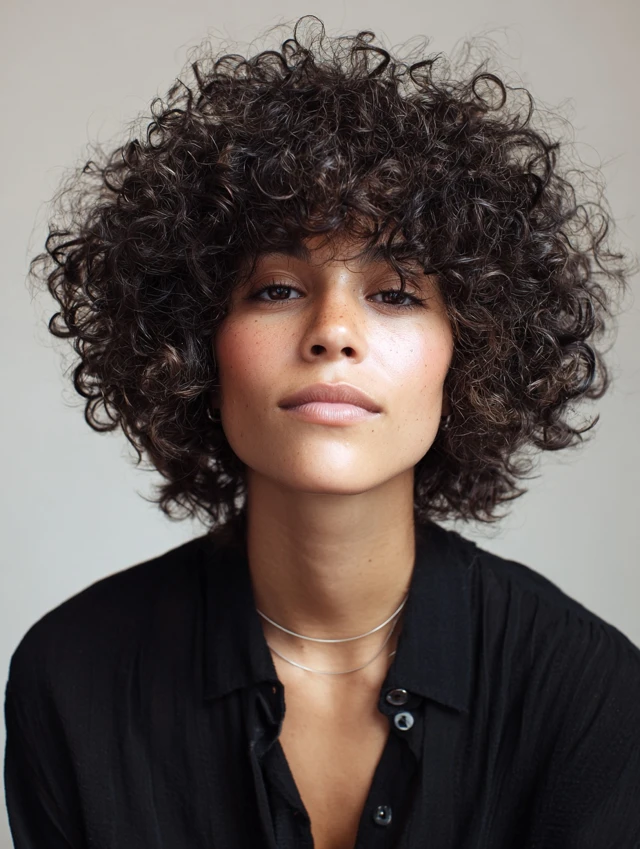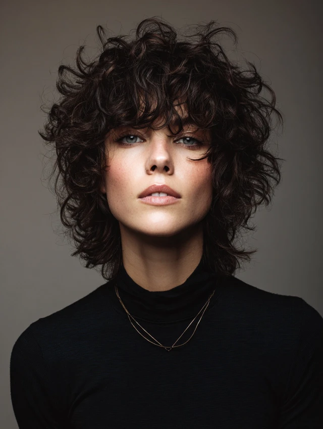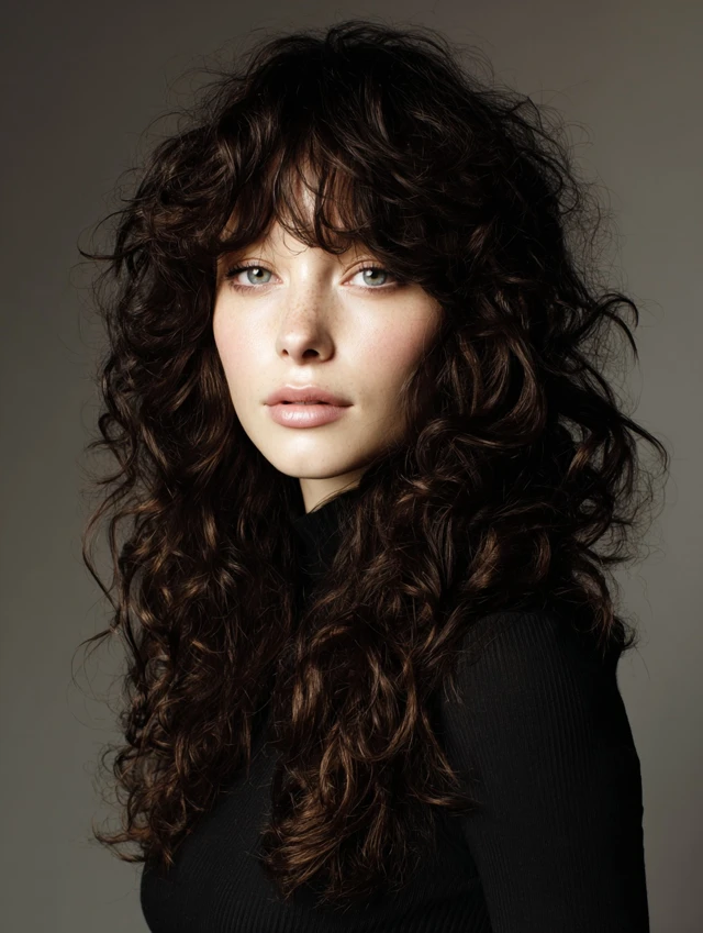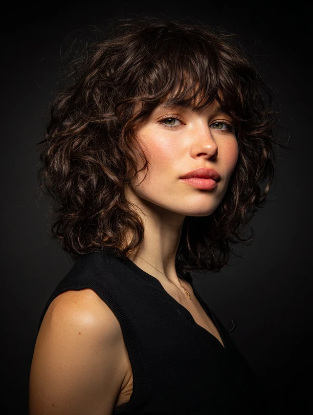Bangs add personality and soften facial features. Curly bangs blend naturally into layered shags, creating balance and movement. Works well for oval and heart faces.