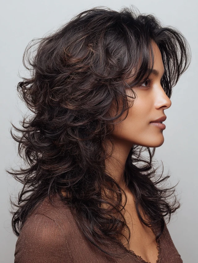 This style blends wolf cut structure with shag layering. Short crown layers and longer ends create bold shape and volume. Best for oval and square faces.