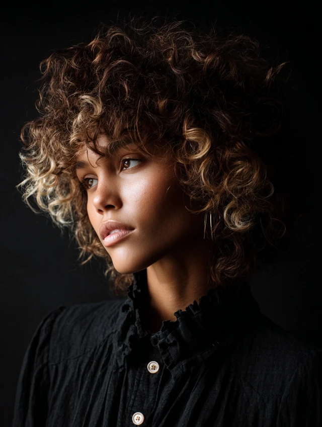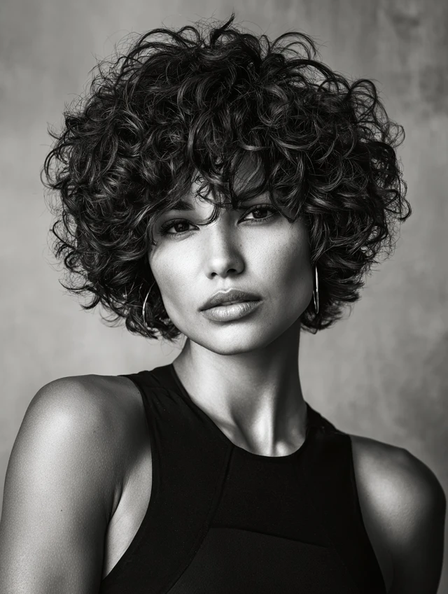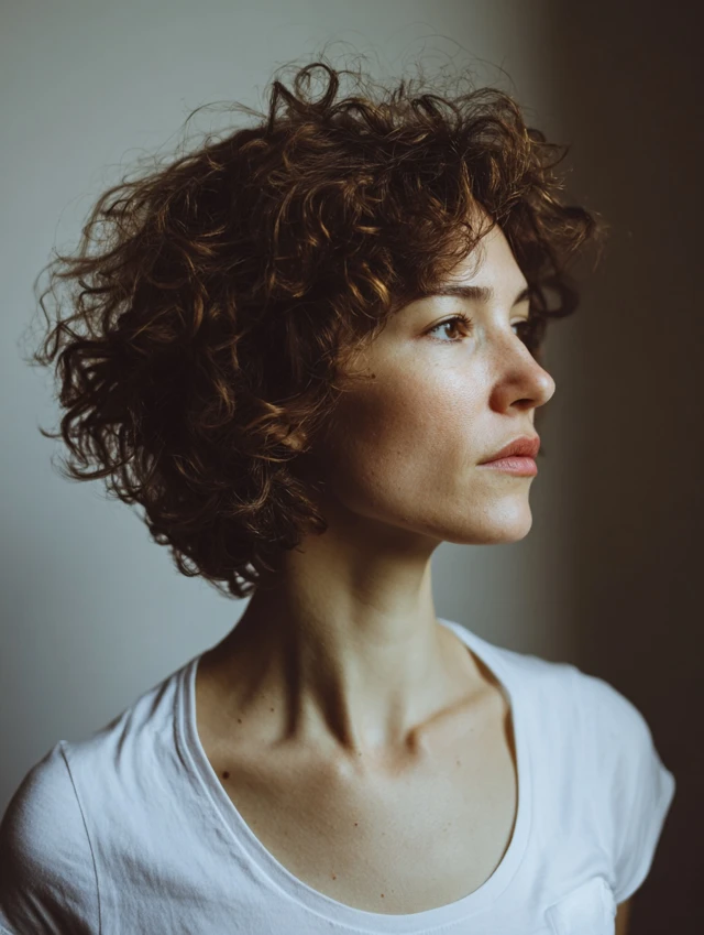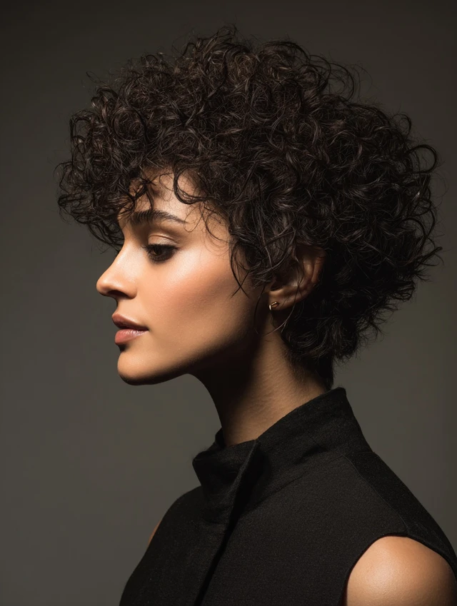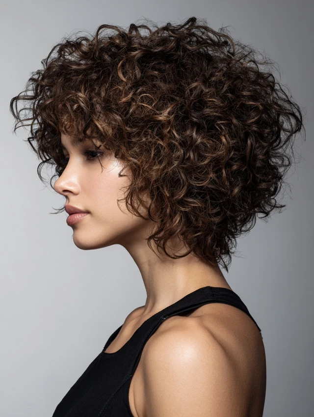 This version keeps length near the jaw while stacking curls high on top. It flatters round and heart-shaped faces by adding vertical lines. Tighter curl patterns benefit from the lift, while looser curls gain bounce from the short crown layers.