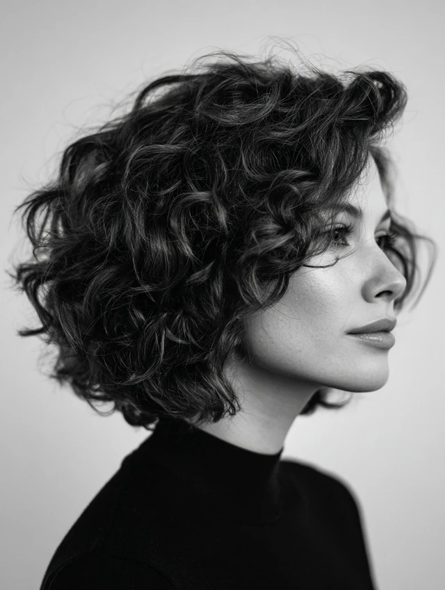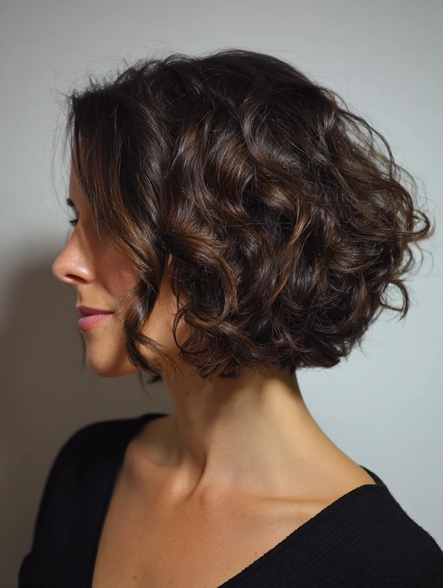 A curly fluffy bob stacks volume softly instead of forming a triangle shape. Layers remove weight from the bottom and let curls bounce freely. It suits square and longer faces especially well because curls frame the cheeks.