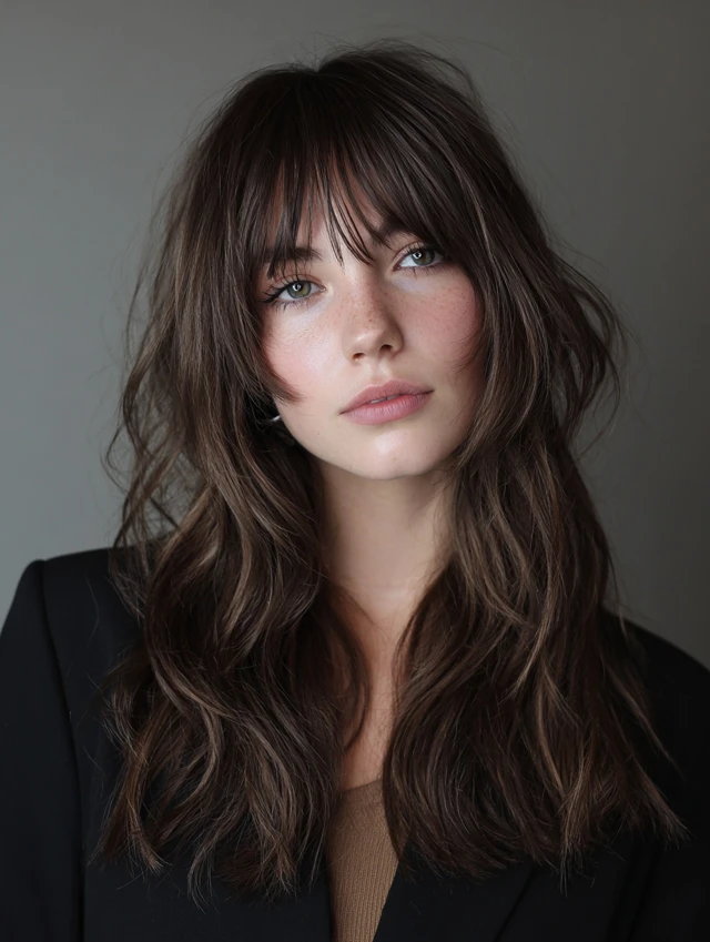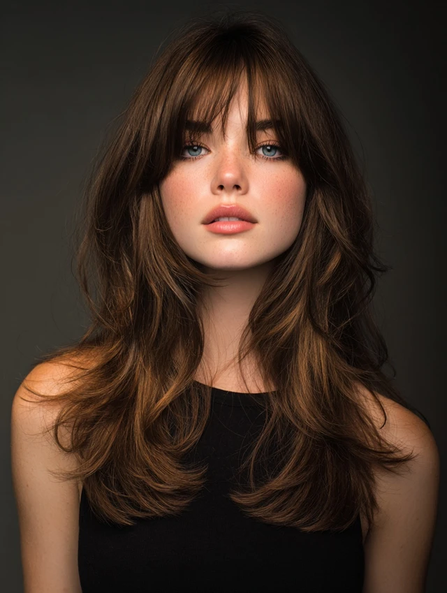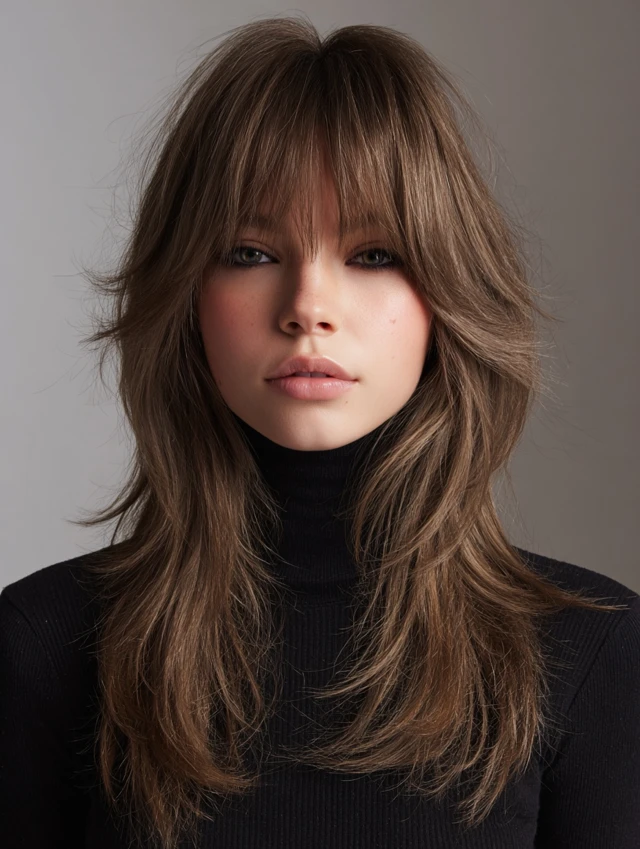 Curtain bangs soften the edges of a fluffy wolf cut while blending into layered sides. Works best for oval and square faces, framing the face delicately and adding playful movement.