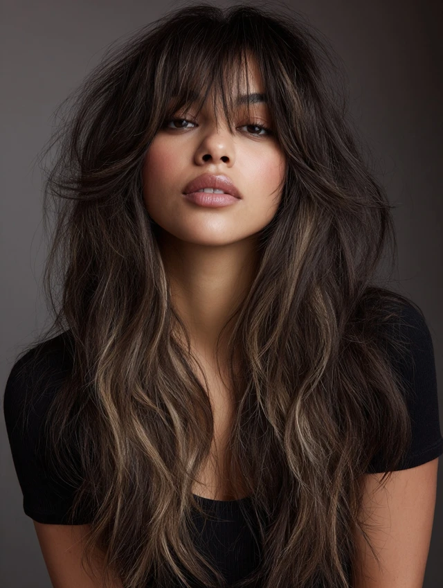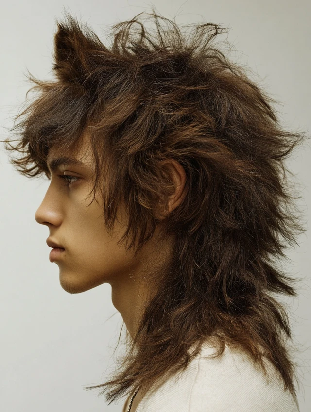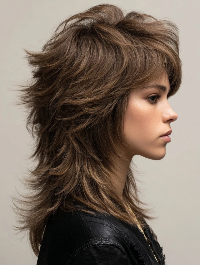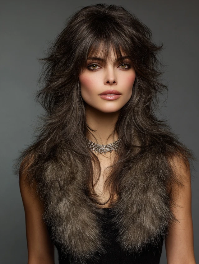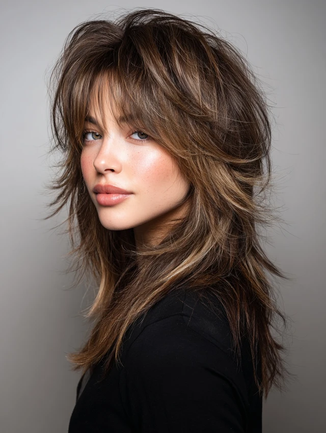The classic fluffy wolf cut features layers at the crown with feathered, flowing ends. Volume is balanced with length for an effortless look. Works well for oval, heart, and round faces, highlighting bone structure while softening angles.