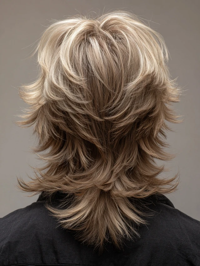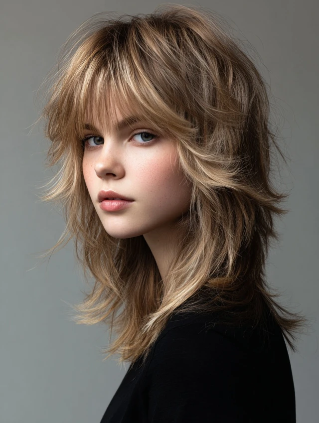 Layered fluffy wolf cuts emphasize crown volume while tapering ends for movement. Layers reduce heaviness and create natural flow. Works well for round or oval faces, lifting and elongating the silhouette.