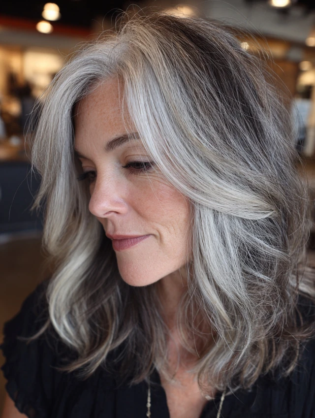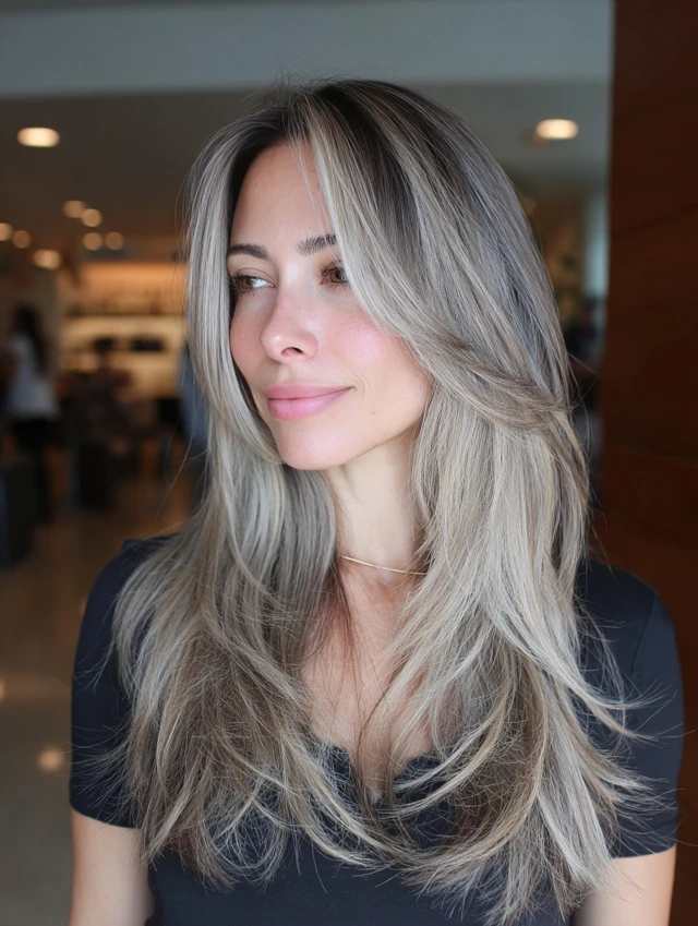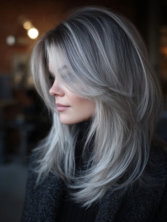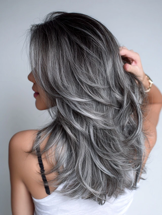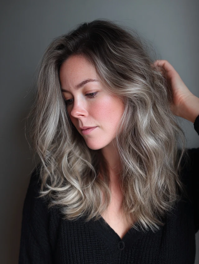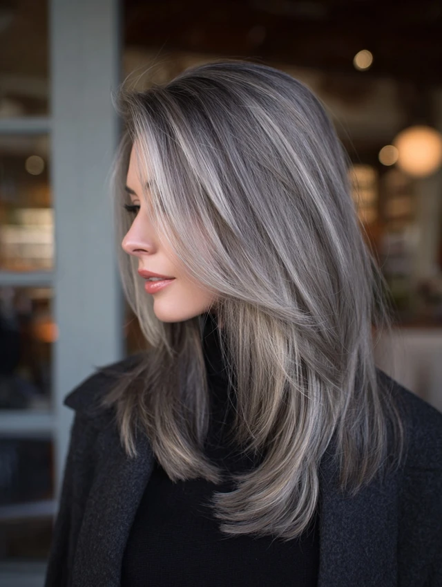 It works best on medium to long hair with layers. Suitable for straight or wavy hair. Gray balayage adds dimension and reduces maintenance while maintaining a stylish, modern finish.