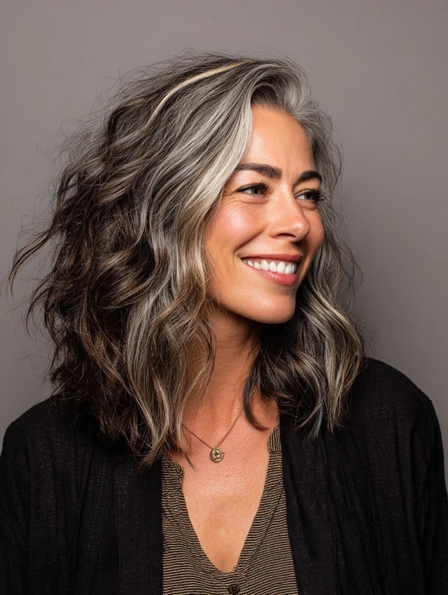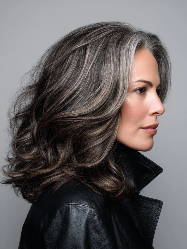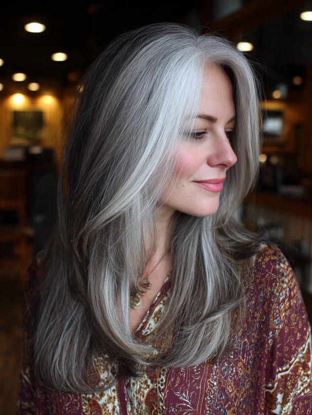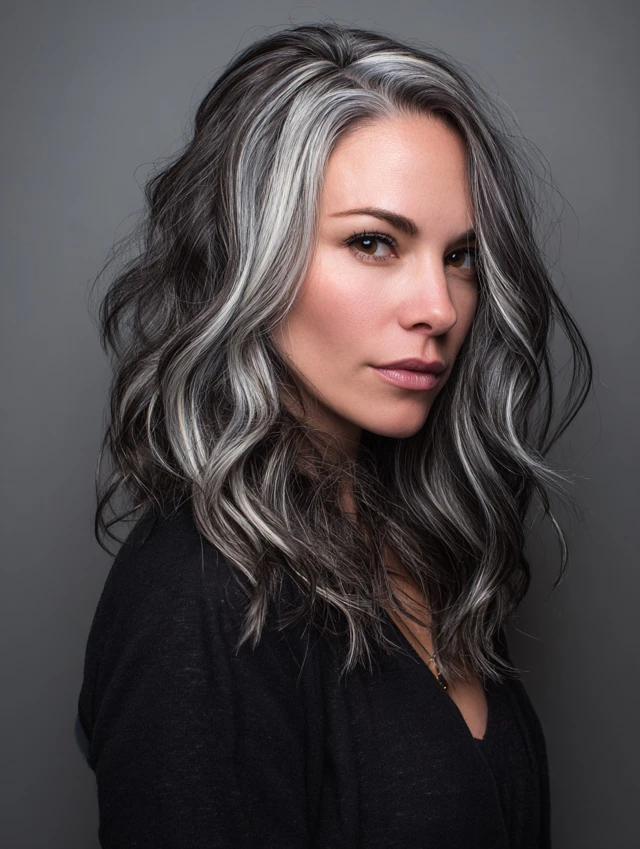 This style works well for medium to long hair and layered cuts. Ideal for straight or wavy textures. Face-framing silver highlights soften features and give dark hair a modern, intentional gray transition.