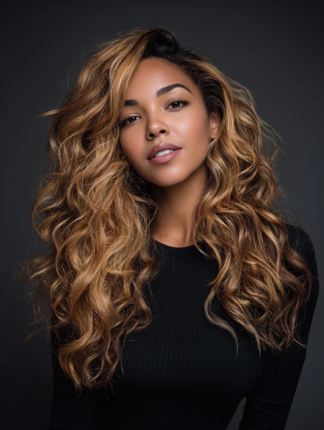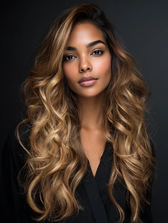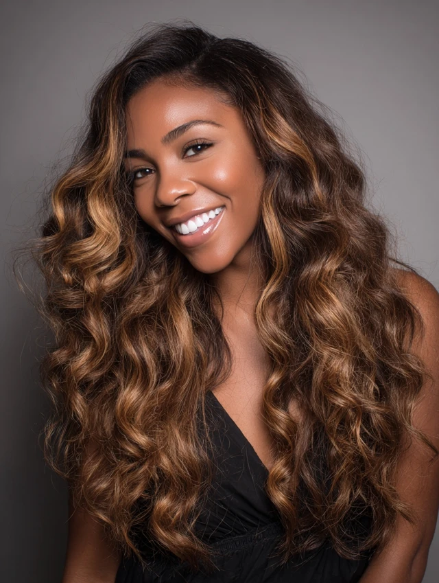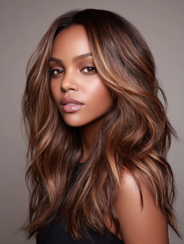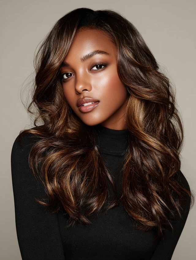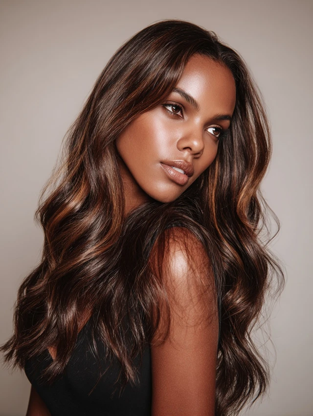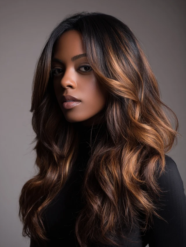 Warm caramel ribbons brighten deep bases and add movement without overpowering natural color. The glow softens features and reflects light beautifully.