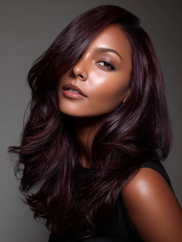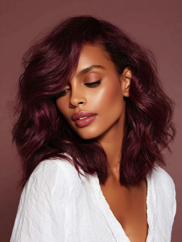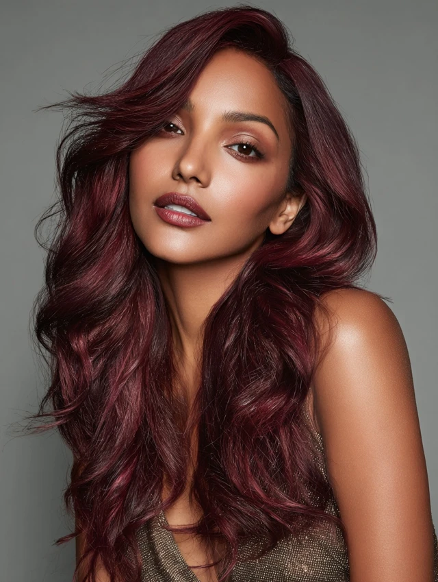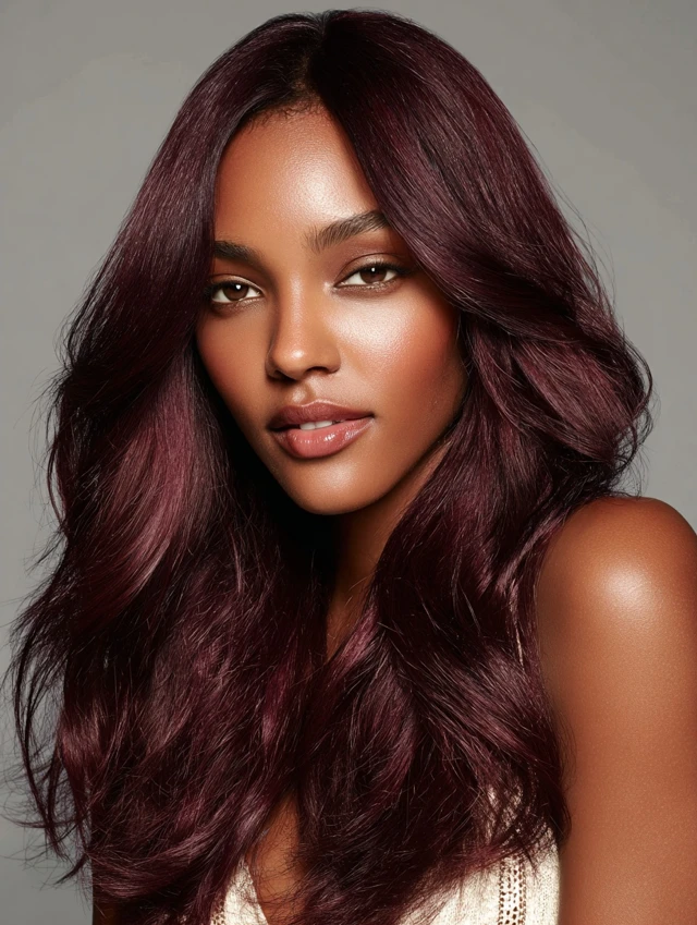 Deep red-purple hues create striking contrast and feel luxurious against brown skin. The result looks dramatic but still refined.