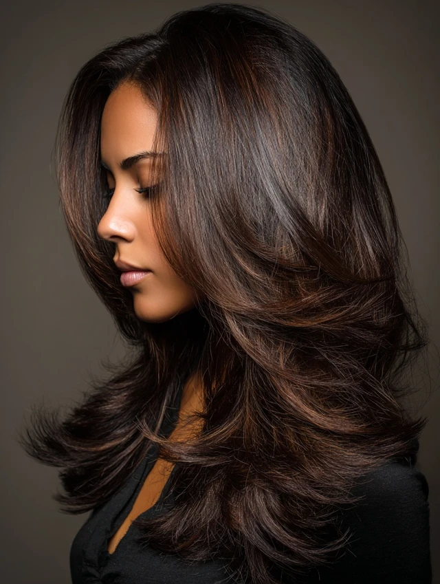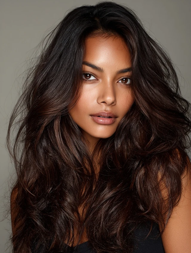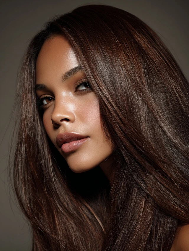 Near-black bases paired with faint brown or mocha strands create quiet dimension and extra shine.