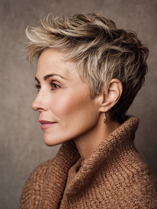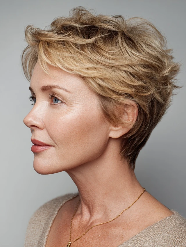 Layered pixies create lift at the crown while keeping sides soft. This short cut looks youthful without being extreme. Works best for oval, heart, and round faces. Layers add movement and texture, preventing hair from looking flat.