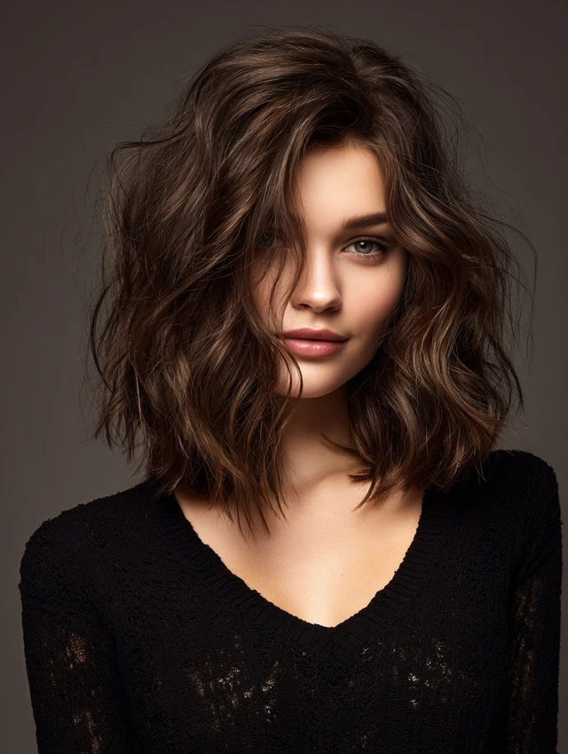A long bob with waves creates volume and softens the face. Works for oval shapes, highlighting natural symmetry while adding texture.