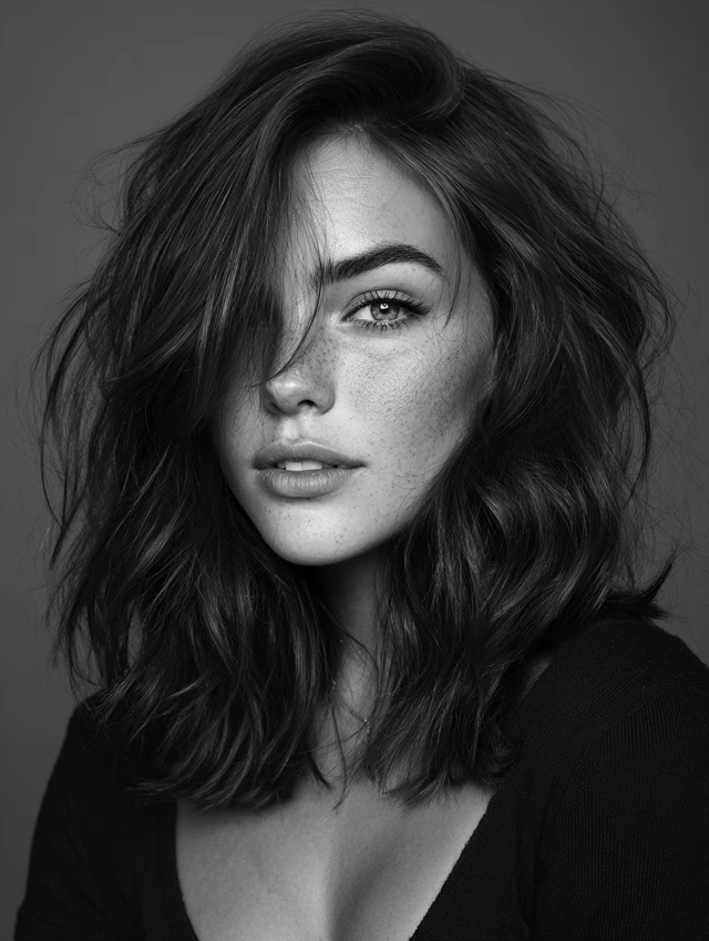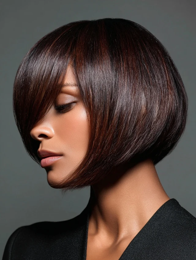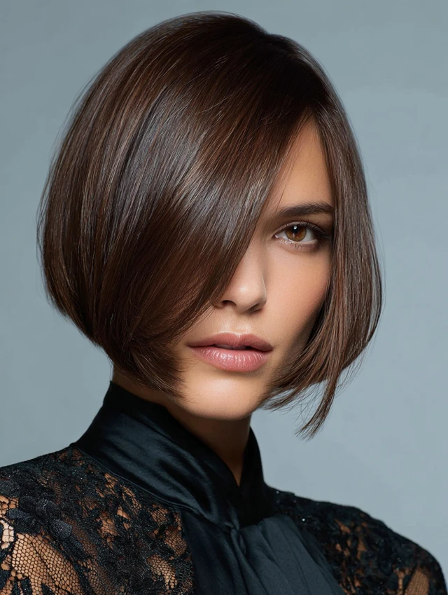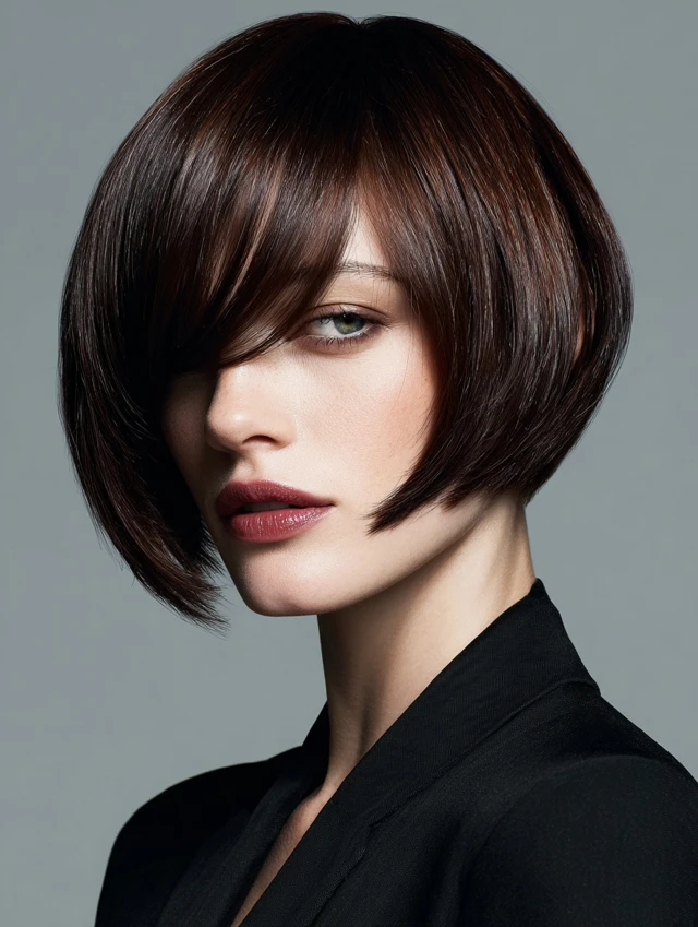 A bob with side-swept bangs frames the face while keeping hair sleek and polished. Works well for oval faces, emphasizing symmetry and cheekbones.