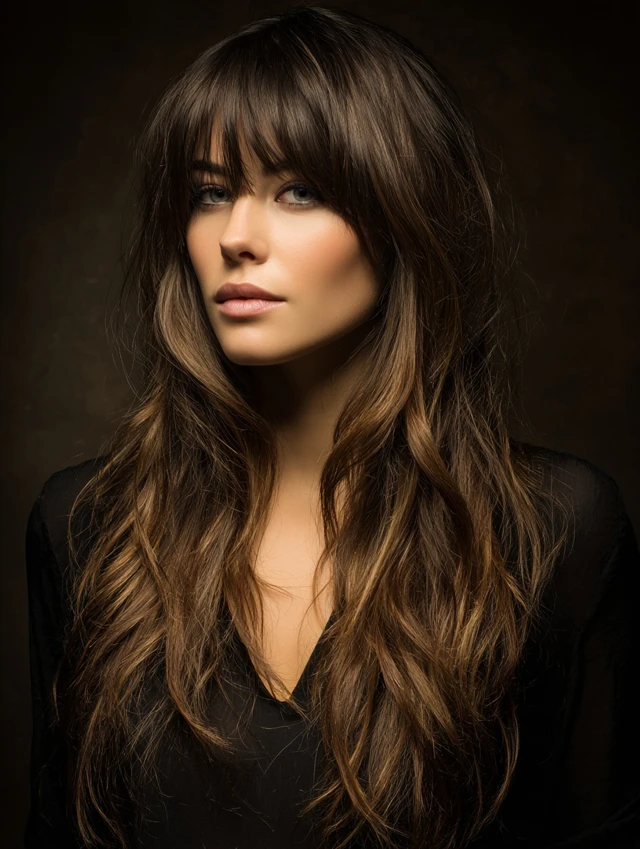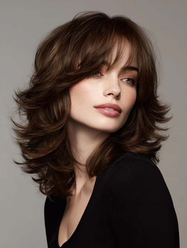 Shorter crown layers paired with longer ends create volume without bulk. Curtain bangs soften the forehead and add body near the front.