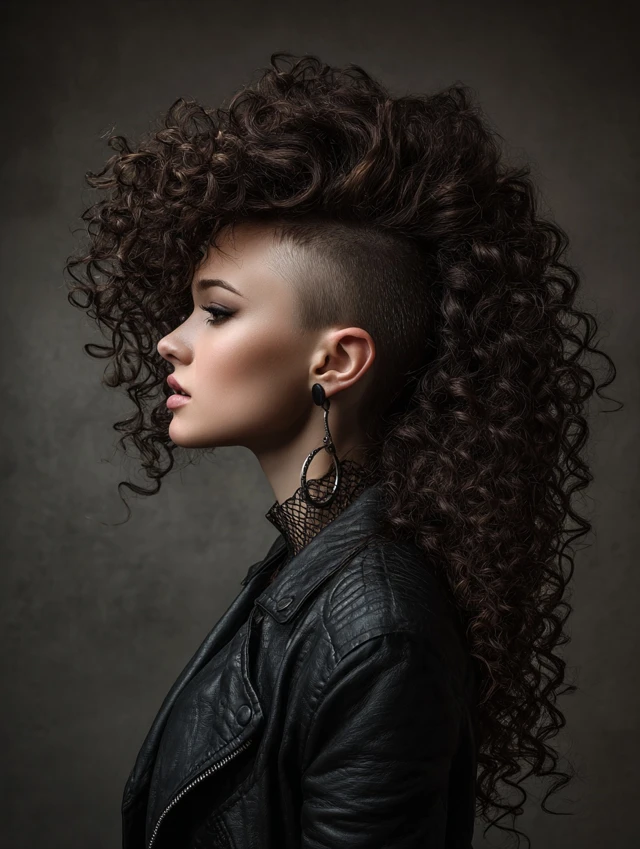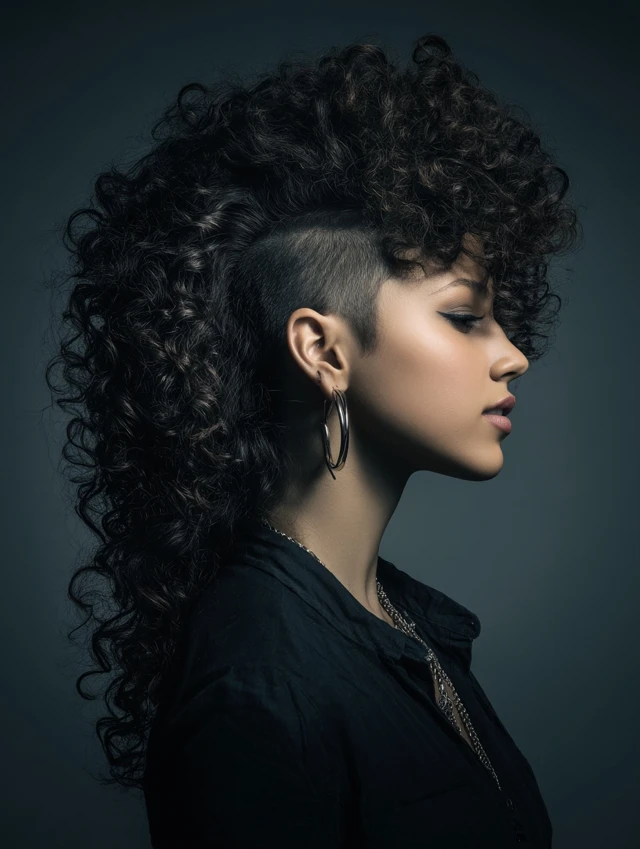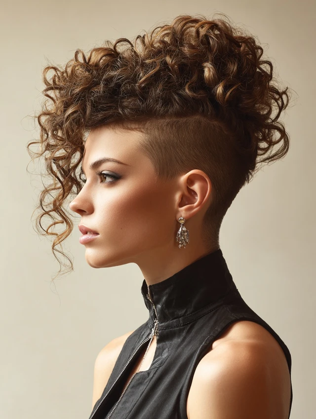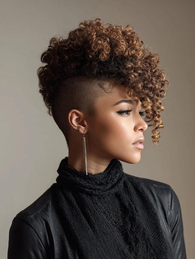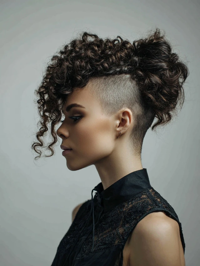 Both sides get shaved while curls pile down the middle for a fierce, mohawk-like silhouette. The height lengthens the face and feels powerful.