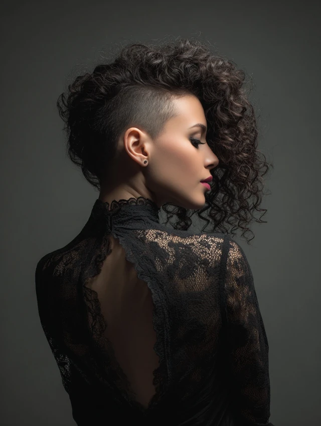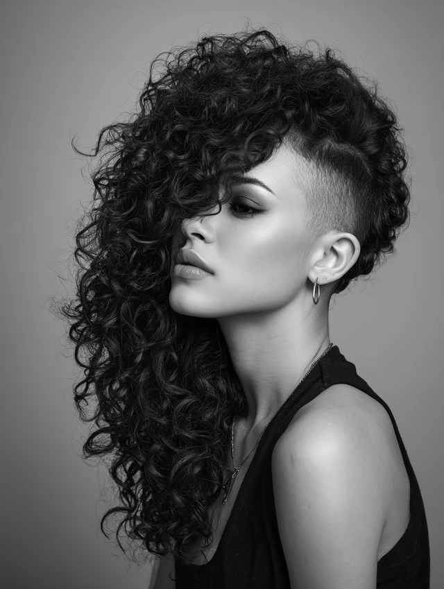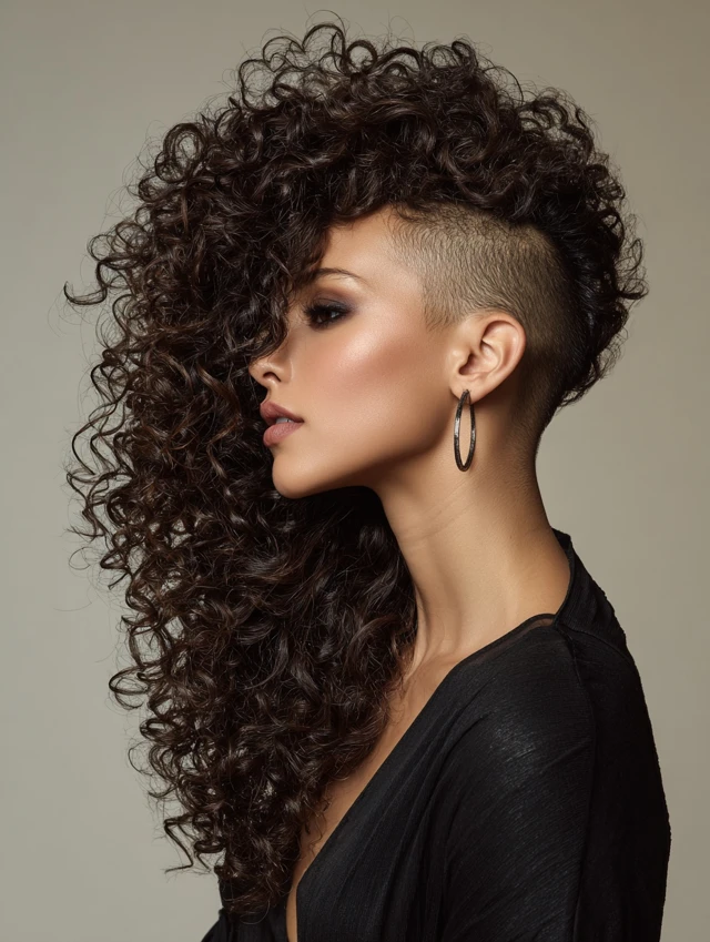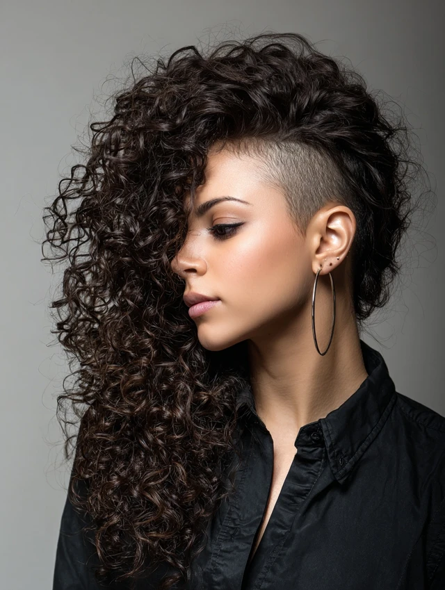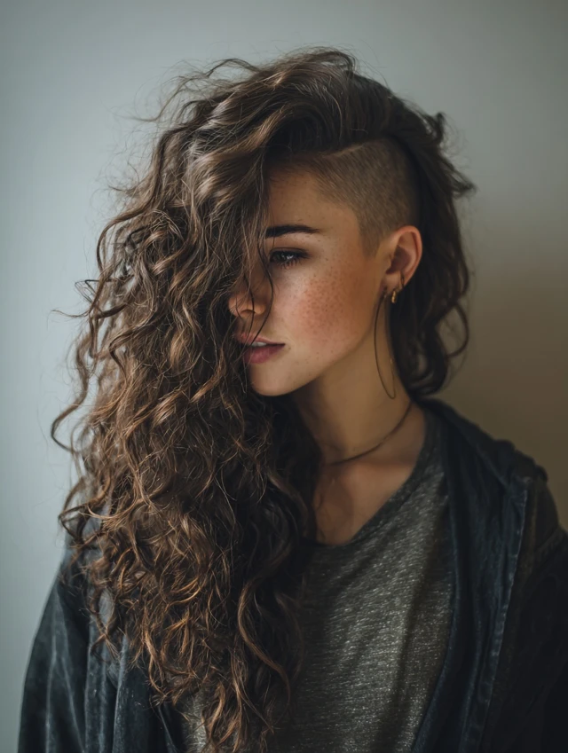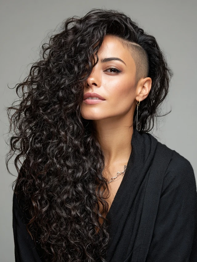 One side stays shaved while curls tumble over the opposite shoulder. The asymmetry slims the face and feels effortlessly rebellious.