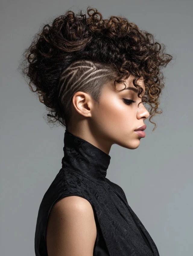Best for medium to thick curls. Define with cream and diffuse upward. This look suits statement wardrobes and nights out. Maintain the shaved side every few weeks.
