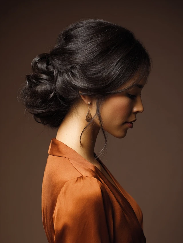 This updo suits oval and square faces. Best for medium to thick hair. Styling includes gentle teasing and pinning at the nape. Perfect for formal events, weddings, or evening occasions.