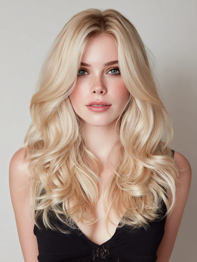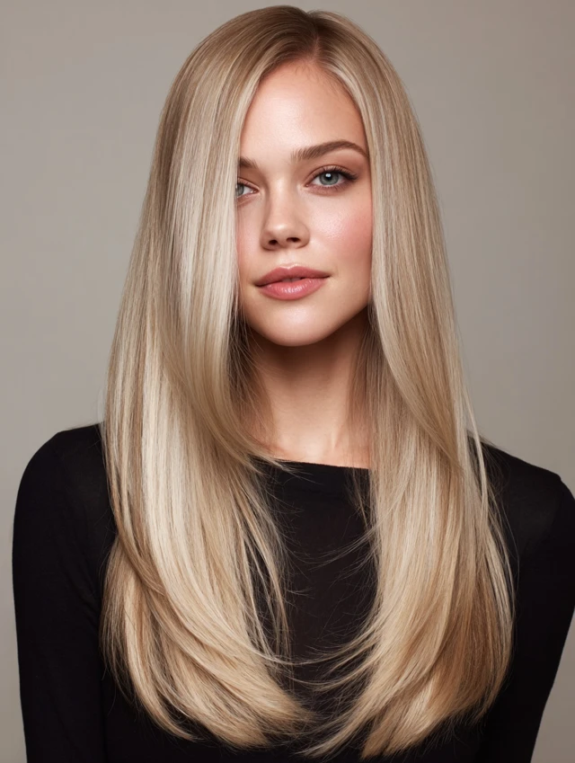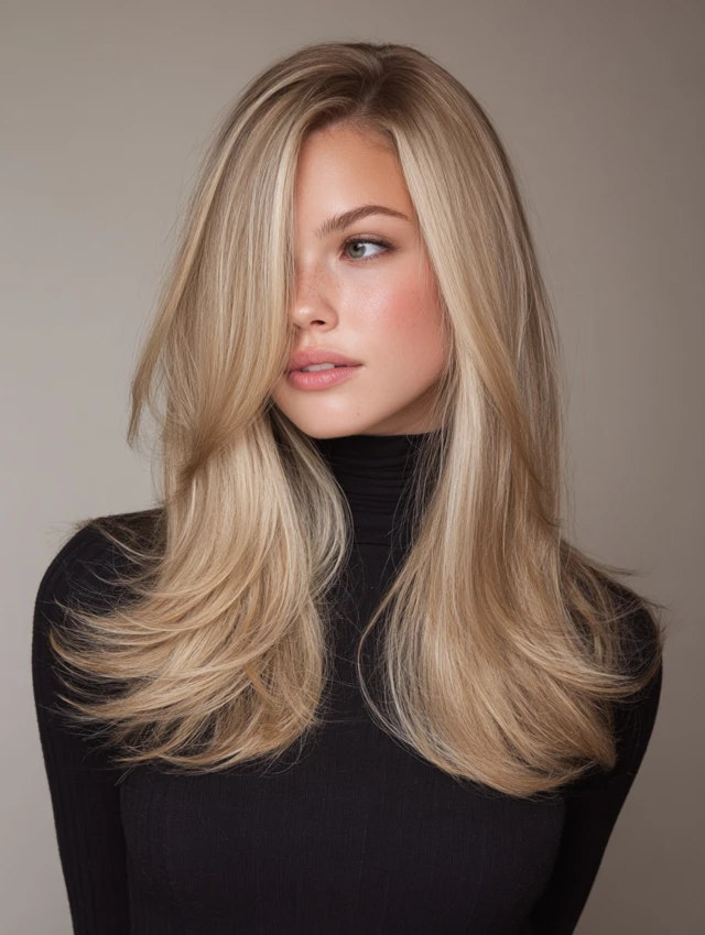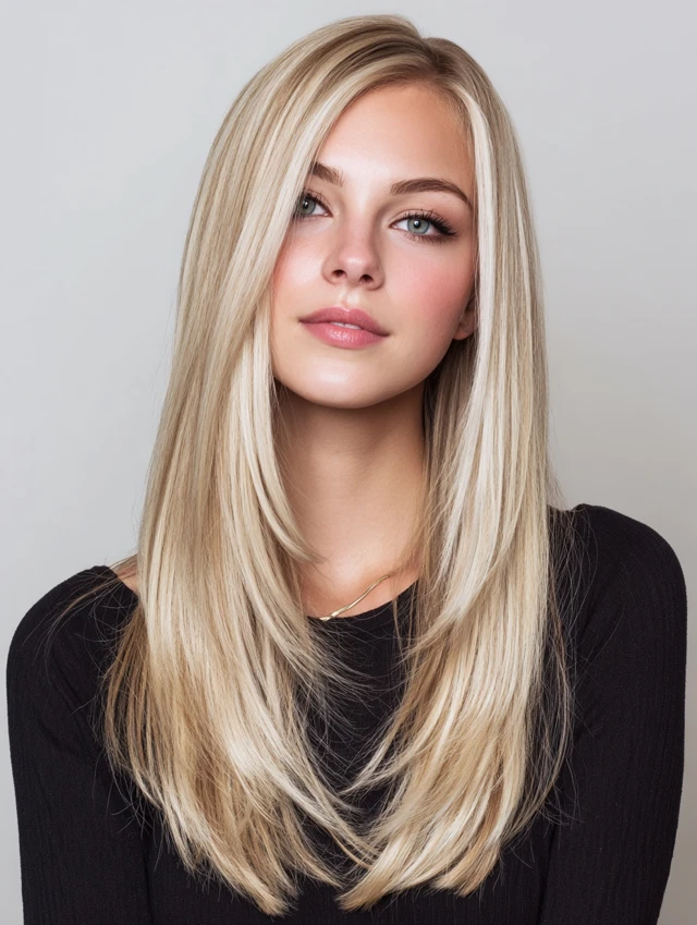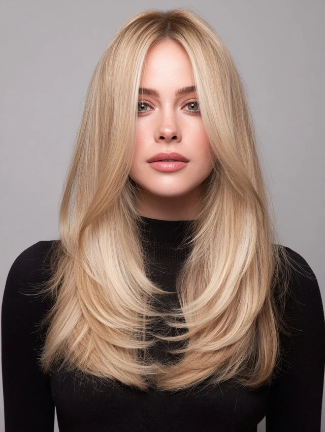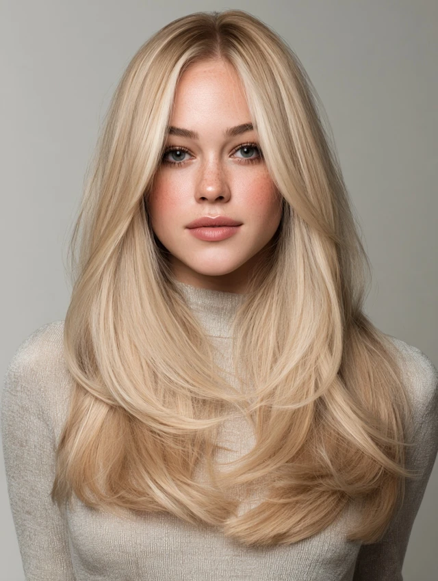 This style features long lengths with invisible layers and a creamy blonde tone. It suits oval and heart-shaped faces because the layers frame cheekbones without crowding them. Medium to thick hair works best since it holds smooth movement through the ends.