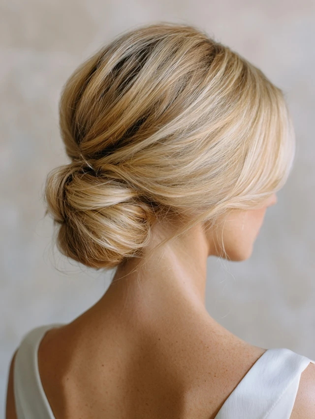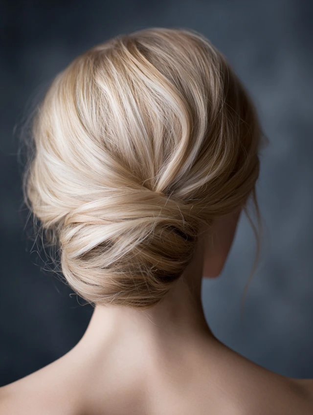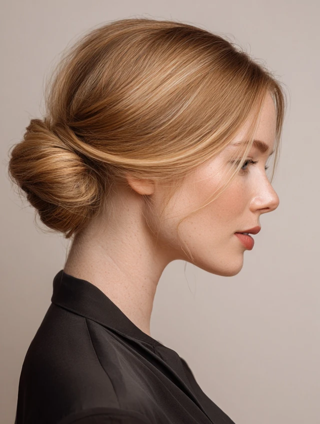 An elegant low bun paired with neutral blonde color feels refined and timeless. It flatters mature features and highlights bone structure, especially on oval or angular faces. Straight or lightly wavy hair styles easiest, though textured hair works with smoothing cream.