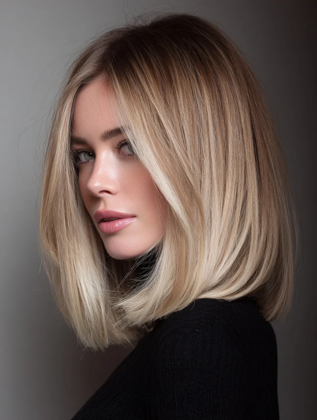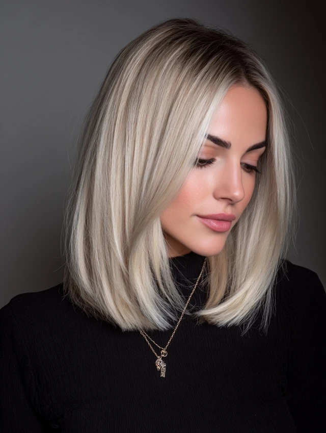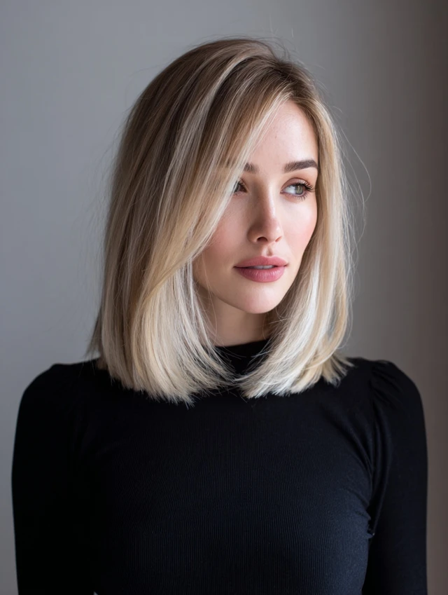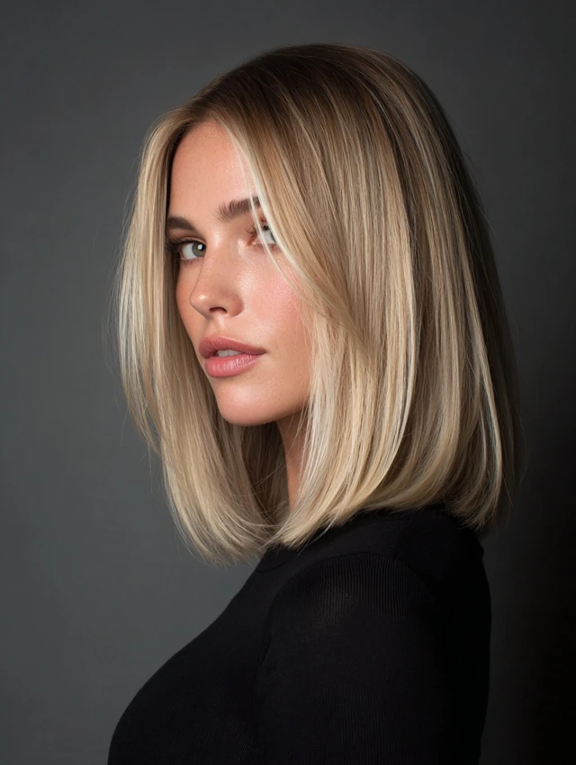A long bob cut just past the shoulders with neutral blonde tones defines quiet luxury. It suits almost every face shape and adapts to straight or wavy textures easily. Fine hair looks fuller when ends stay blunt but lightly textured.