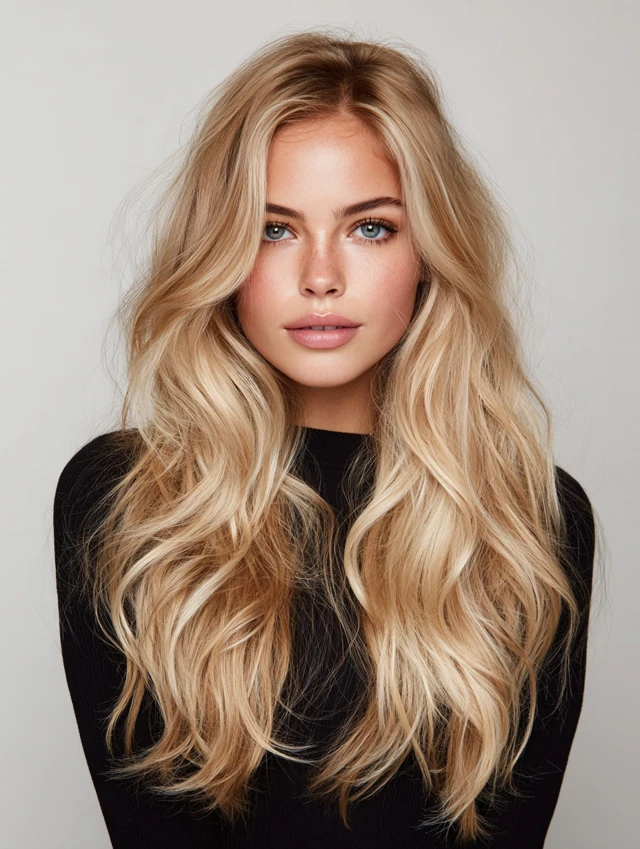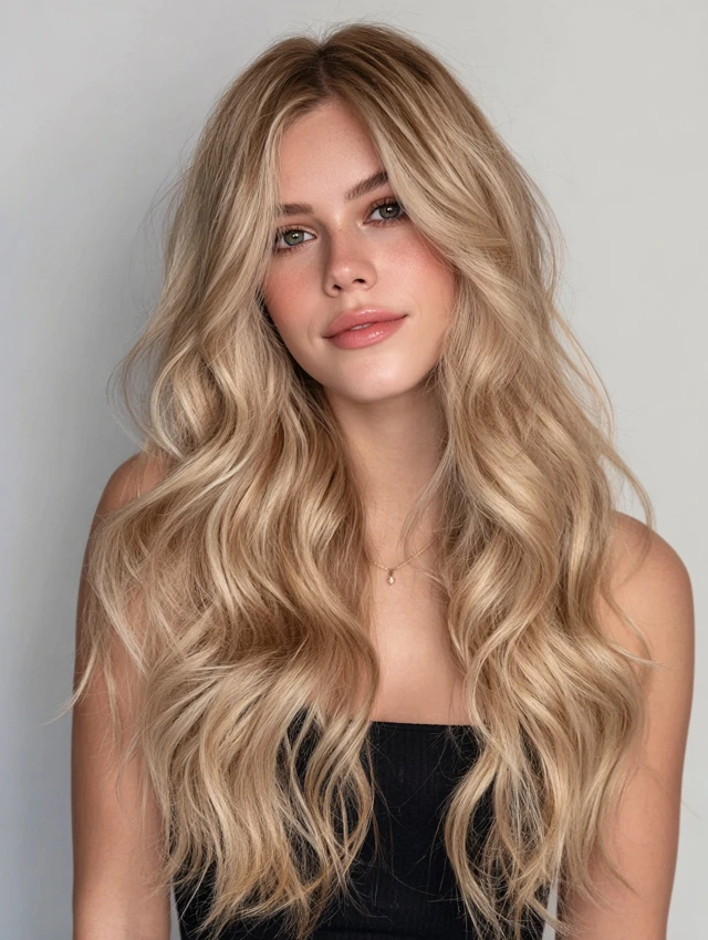 Loose waves with a middle part create symmetry and calm structure. Champagne blonde shades add brightness without looking pale or artificial. This style works well for round or square faces because the length and wave pattern soften edges.