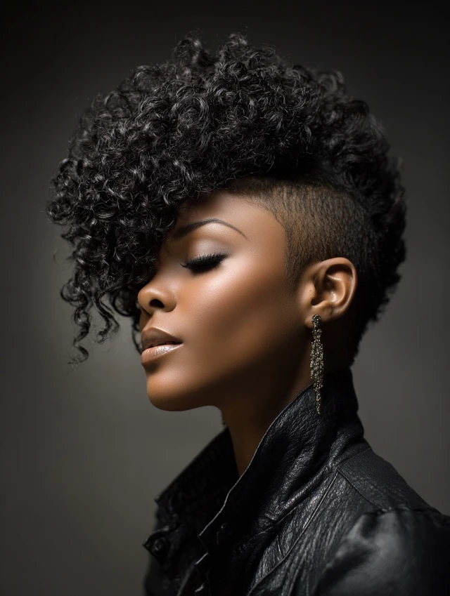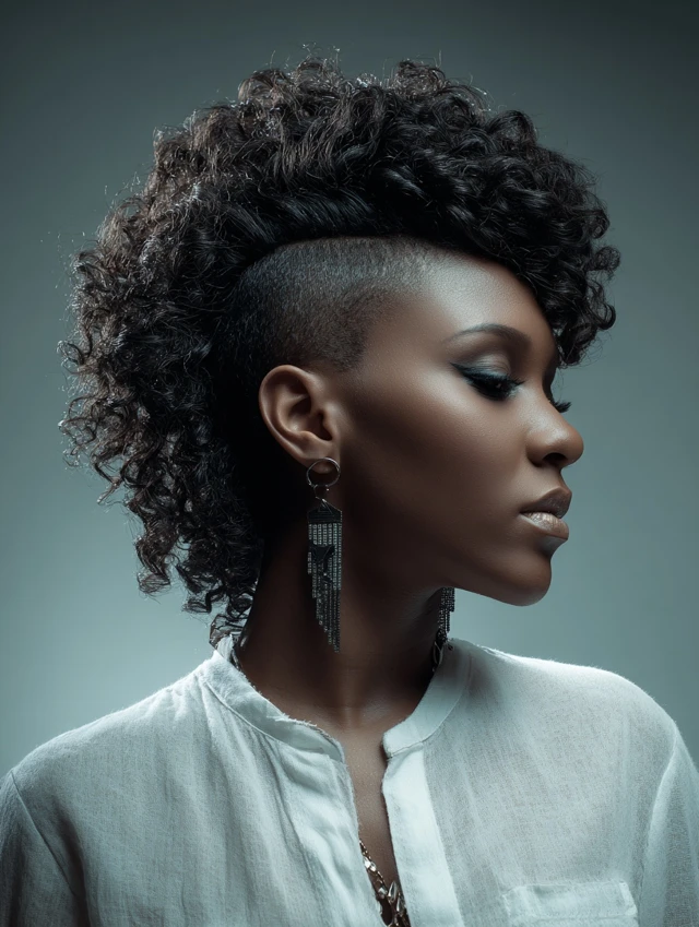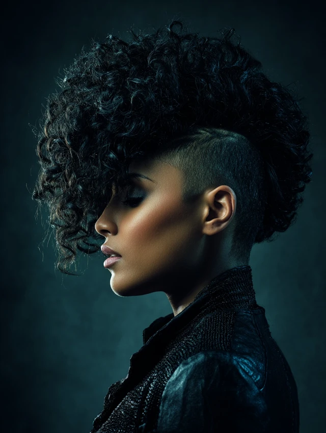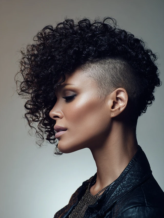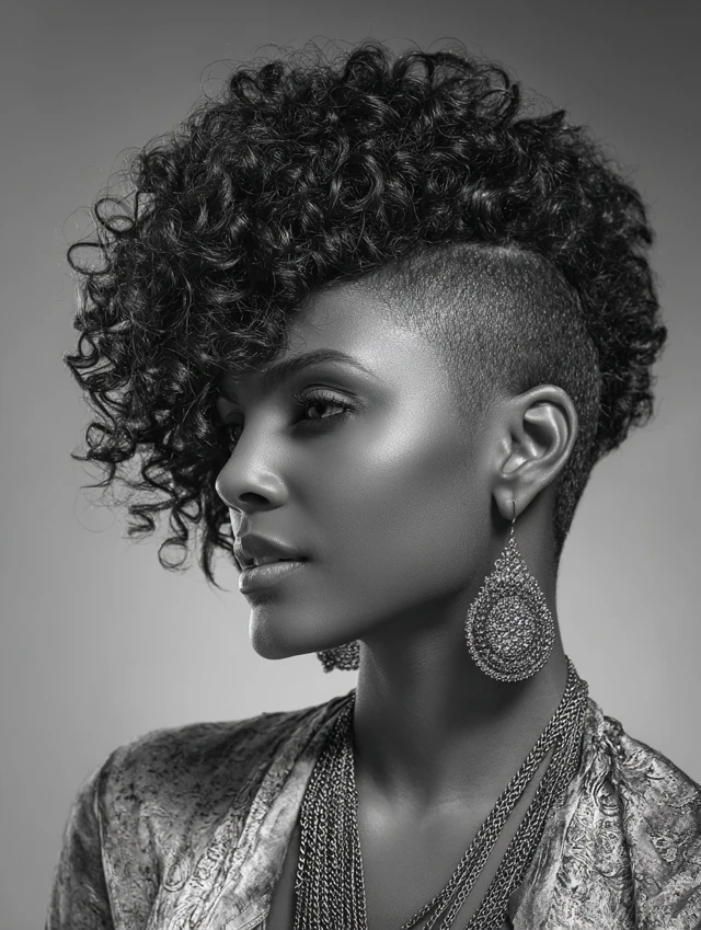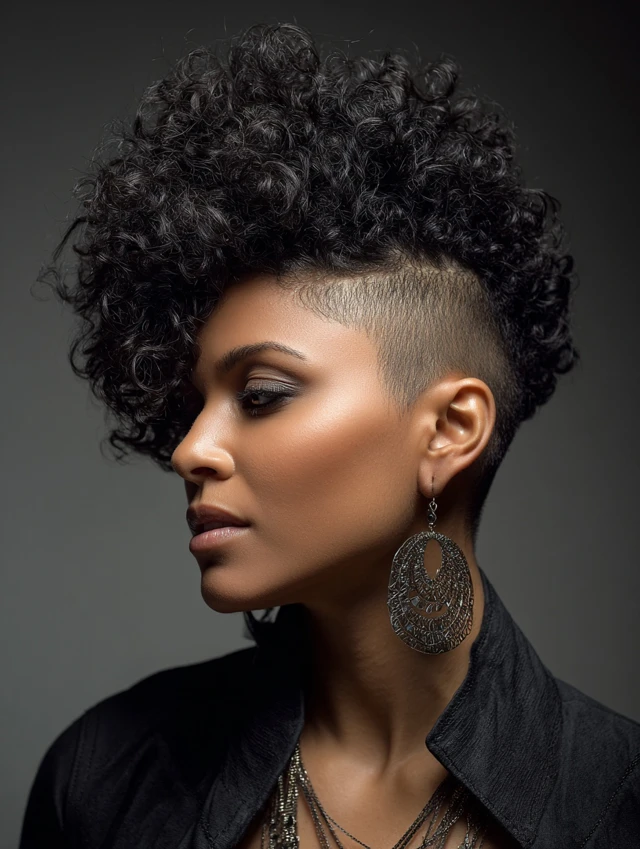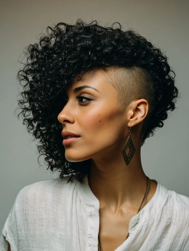 Curls pile high down the center while one side gets shaved for edge. The height stretches the face and creates serious presence.